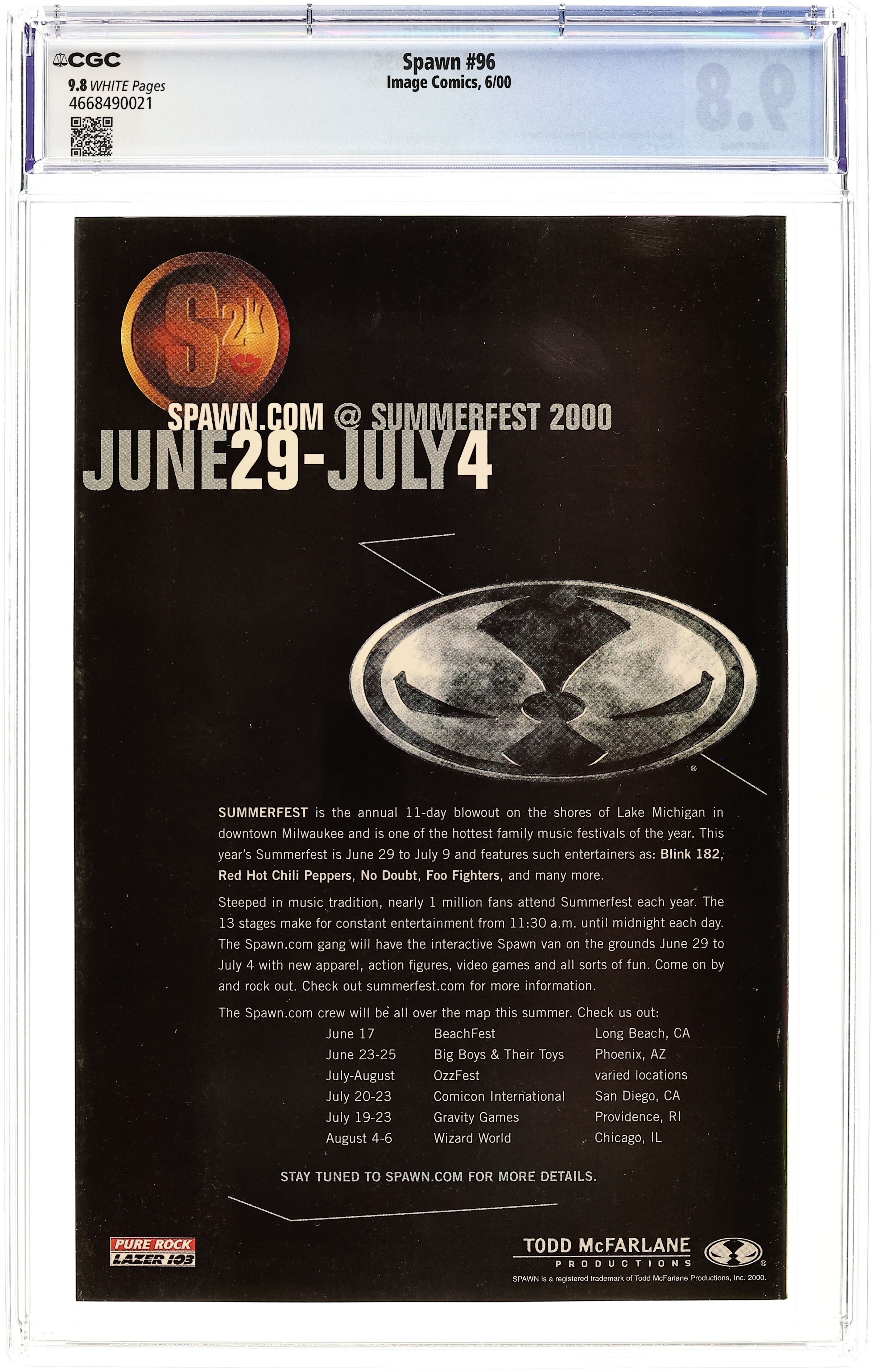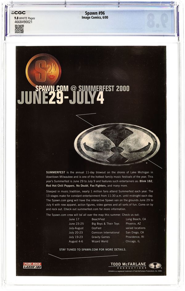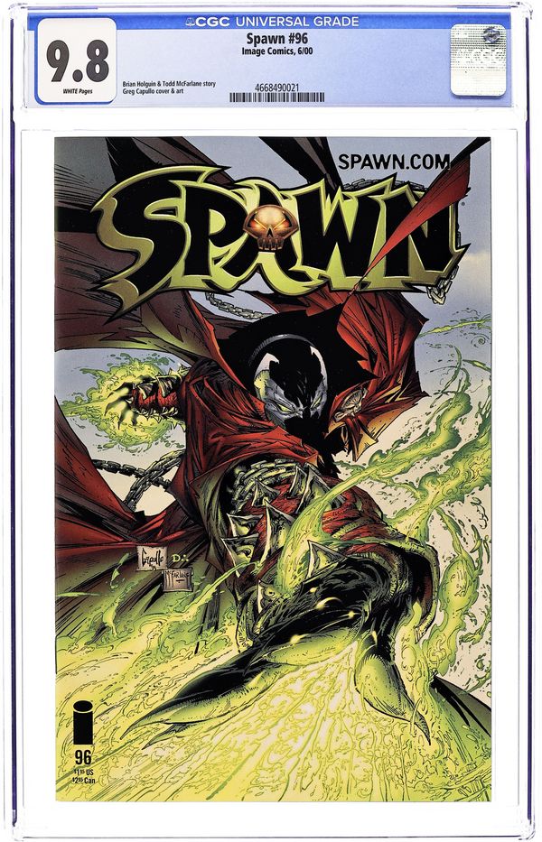 Todd McFarlane Productions (W) Brian Holguin & Todd McFarlane (P) Greg Capullo (I) Danny Miki (C) Brian Haberlin, Cover by Greg Capullo & Todd McFarlane "Cracks in the Foundation"?Spawn sees a glimpse of what the future could hold for mankind if he should fail in his struggle against both Heaven and Hell. Battle lines are drawn and allies and enemies begin to line up with some big surprises on both sides. This issue lays the foundation for the earth-shaking events of Spawn #100 and presages the return of some of the most popular characters in the Spawn canon. Don't miss it! FC, 32pg" Cover price $1.95.
