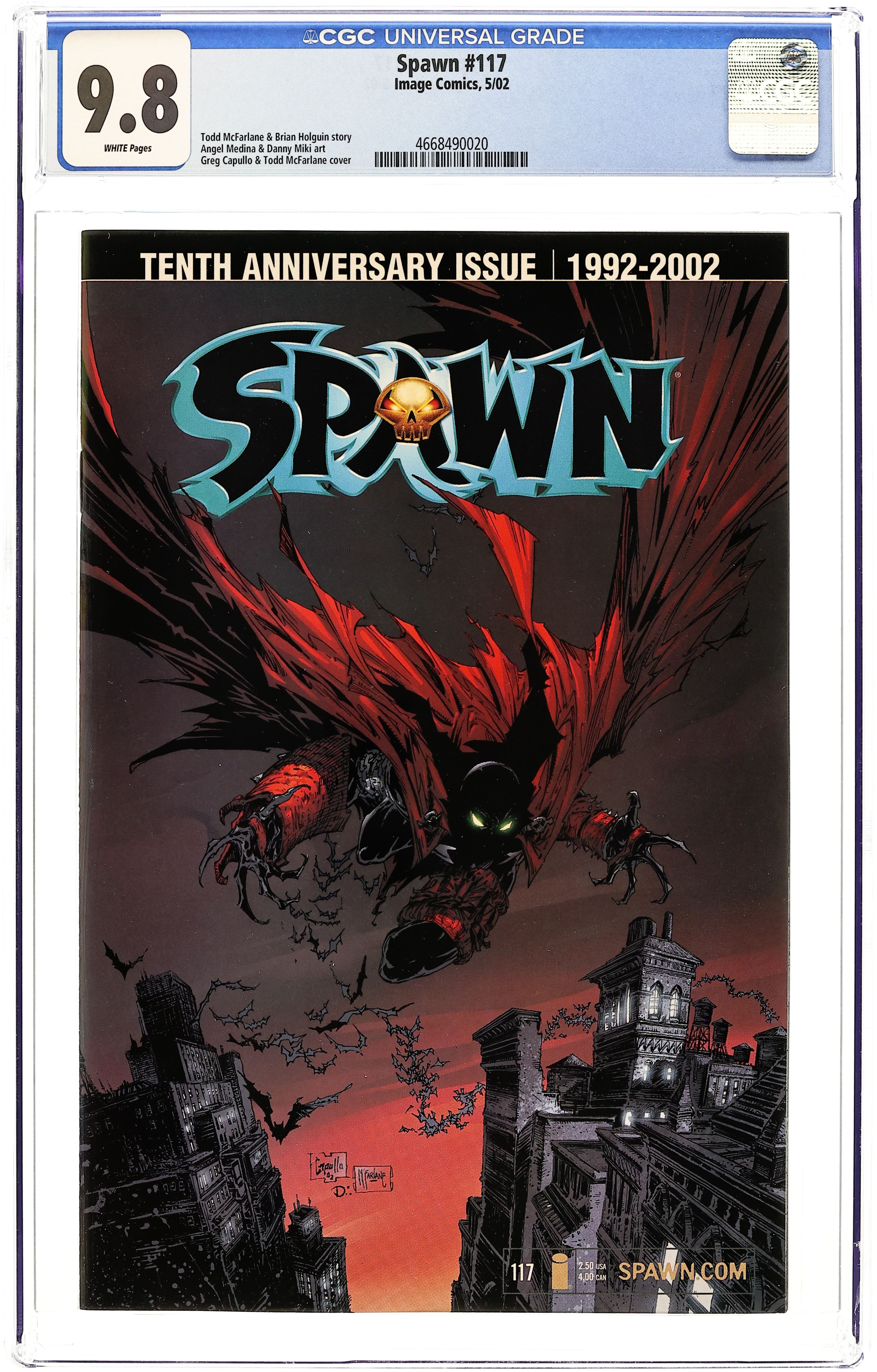 Newsstand Edition. Written by Todd McFarlane and Brian Holguin. Art by Greg Capullo and Danny Miki. Cover by Greg Capullo and Todd McFarlane. "The Conqueror!" Spawn approaches Sam and Twitch again about an effective way to stop Billy Kincaid from supplying Hells army with souls. Meanwhile, a reassigned Jason Wynn hallucinates that he is a powerful, deadly, and ruthless as the legendary Genghis Khan. As he imagines himself Jason the Conqueror, he opens fire on innocent people in a restaurant. Later, when he returns to reality, he finds himself dirty and disoriented in Spawns alley where Bobby befriends him. 32 pages, FC. NOTE: This issue is dedicated to Phillip Qzersky. Cover price $1.95.
