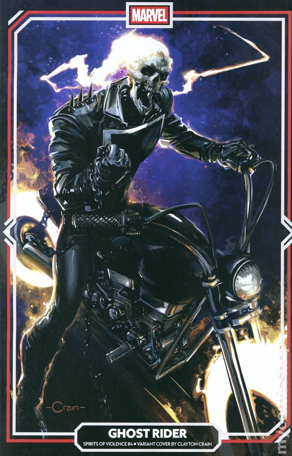 Limited 1 for 50 Retailer Incentive Variant Cover. (W) Sabir Pirzada (A) Paul Davidson (CA) Clayton Crain THE SPIRIT OF VIOLENCE has set its sights on everything the GHOST RIDERS of the Marvel Universe hold dear, but none have drawn its wrath more than Johnny Blaze! As his heart and soul have been torn apart, his body now follows in one of the most painful moments in GHOST RIDER history! Cover price $3.99.