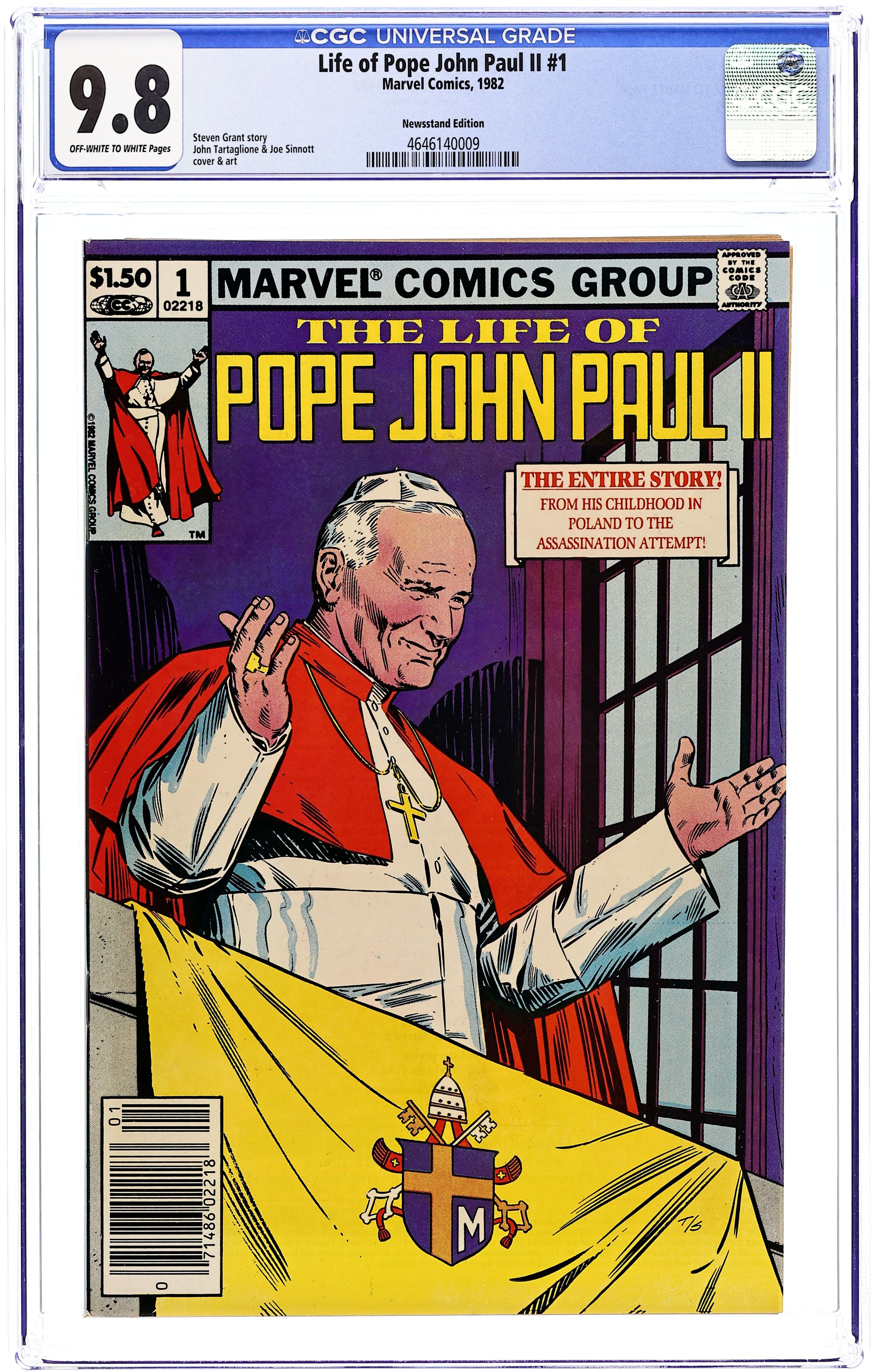 Newsstand Edition. Written by Steven Grant, plus an introduction by Cardinal Jose Saraiva Martins. Art and cover by John Tartaglione. Marvel commissioned this ad-free title, one of the earliest biographical comics from a mainstream publisher, shortly after the ordination of John Paul II. Father Mieczyslaw Malinski, a lifelong friend of the first non-Italian pope, and two Marvel staffers present the Popes life story, including his youth in Poland, his support of the Resistance during World War II, and the unsuccessful attempt on his life in 1981. 64 pages, Full Color. Cover price $1.50.