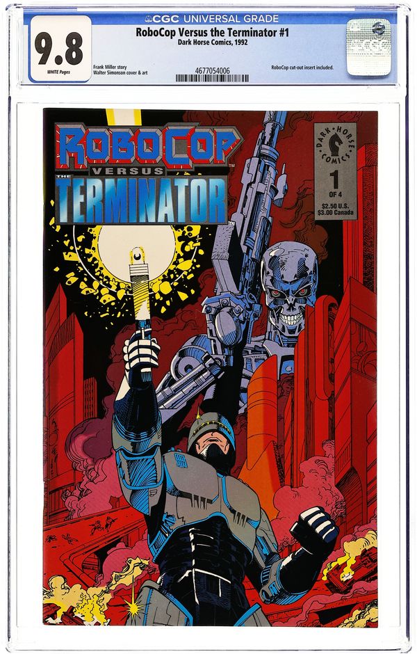 Writer: Frank Miller. Artist: Walter Simonson. Cover Artist: Walter Simonson. Letterer: John Workman. Colorist: Steve Oliff Genre: Science-Fiction, Action/Adventure. Trapped in the machine-ruled time of the Terminators, the newly constructed RoboCop of the future launches a full-scale war against the forces of Skynet. But that's just the first step for RoboCop: the final phase comes when he uses Terminator technology to send himself back to his own time to destroy not only the as-yet-unaware Skynet computer, but himself as well. Cover price $2.50.