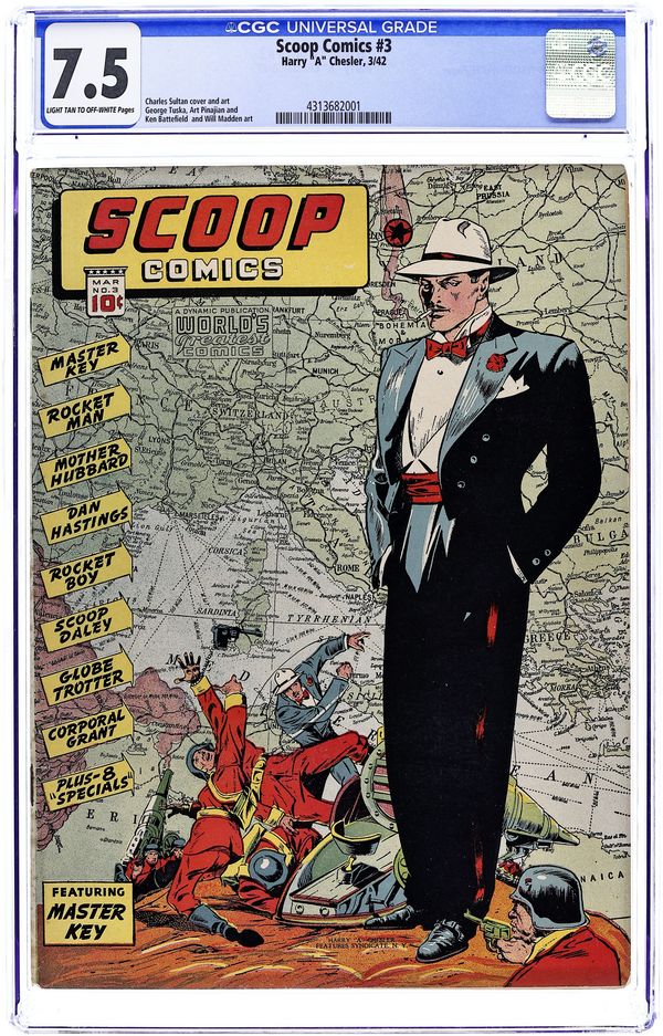 Stories and art by George Tuska, Ken Battefield, Ernie Hart, Charles Sultan, Richard Speed, Bill Madden and Art Pinajian. A catch-all anthology from Chesler / Dynamic, featuring adventure, superheroes and comedy. Rocketman investigates after an atomic scientist is murdered and his daughter is kidnapped. Rocket Boy takes his flying suit to Africa to solve the mystery of his father's disappearance, but first he must find a lost diamond mine and battle a lion. In a macabre, unusual story, heroic witch Mother Hubbard battles a band of ogres that are stealing children's eyes; if she beats them, she can magically restore the eyes. Mother Hubbard was listed in Jon Morris's 2015 book The League of Regrettable Superheroes. Fun cover by an unknown artist. Master Key; Rocketman; Plenty of Noise for a Penny; Mother Hubbard; Scoop Daily: Sacrifice; Rocketboy; Globe Trotter; Dan Hastings: The Return of Dr. Strange; Corporal Grant. Title changes to Yankee Comics (1941 Armed Service Edition) for issues #4-7. 48 pages, Full Color. Cover price $0.10.