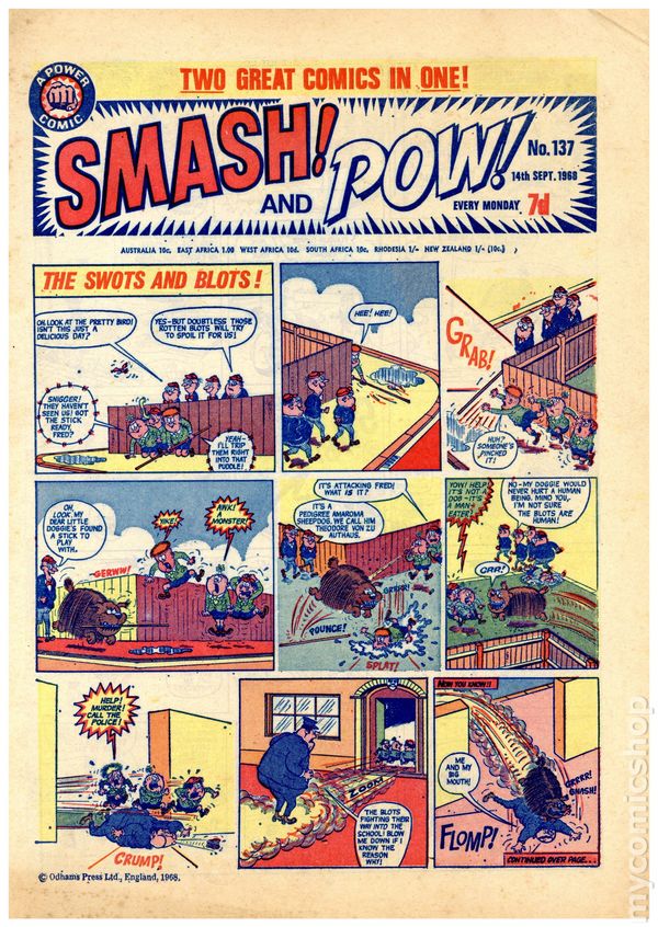 Issue 137 - September 14, 1968. Merged with Pow! weekly comic. Spider-Man, Batman and Daredevil reprints. Strips include Swots and the Blots, Brian's Brain, The Cloak Meets Deathshead, Bad Penny, The Nervs and many more. 9 1/4-in. x 13-in., 28 pages, black and white.