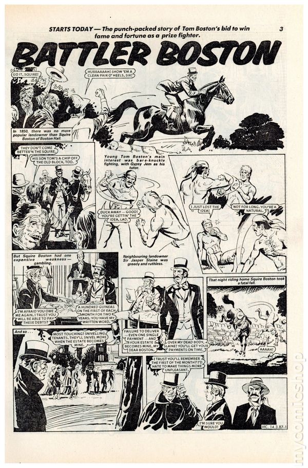 UK series. March 14th, 1987. Stories include Victor, Battler Boston, You're in the Navy Now!, The Jewel and the Sword, Hallam's Hardest Mission, The Hammer Man, Grasshopper Green, The Goals of Jimmy Grant, and It's a Dog's Life. 8 1/4" x 11 7/8", 32 pages, B&W, 22p cover price.
