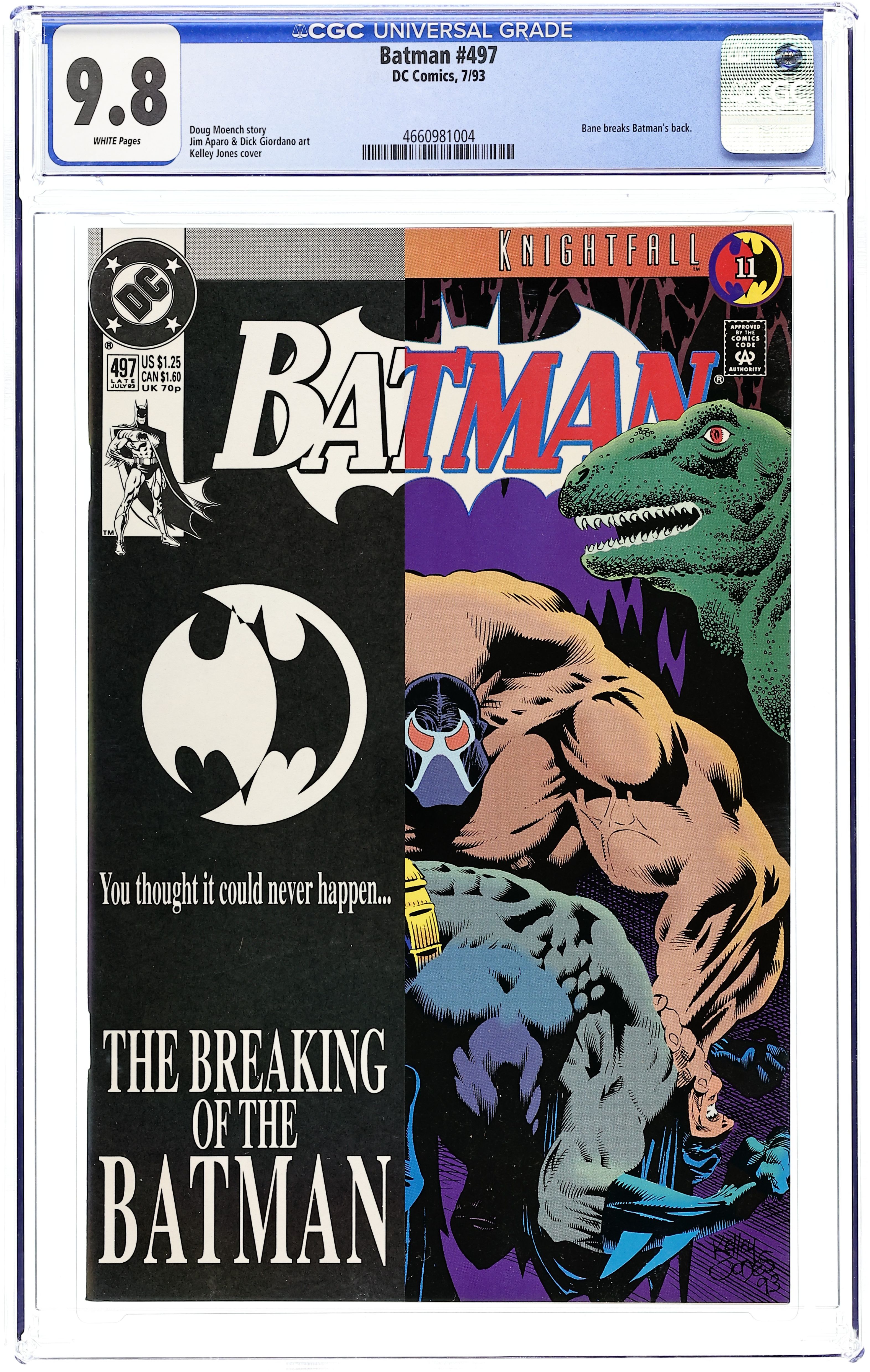Starts Apr 4 Direct Edition with Overlay cover. Bane breaks Batman's back in Batman KnightFall Part 11. Home turf does not prove an advantage when Bane breaks Batman's back in the Batcave in "The Broken Bat." KnightFall continues in Detective Comics (1937- ) #664. Written by Doug Moench. Pencils by Jim Aparo. Inks by Dick Giordano. Cover by Kelley Jones. 36 Pages, Full Color. Cover price $1.25.