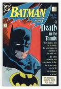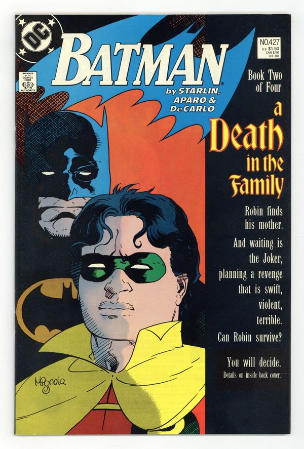 Ends Feb 9 7:32 PM CST Bid History 5 bids Current Bid $21 Your Secret Max Bid If you'd like to bid, please log in or register. First printing. Direct Edition. Cover art by Mike Mignola. "A Death in the Family" part 2 of 4, script by Jim Starlin, pencils by Jim Aparo, inks by Mike DeCarlo; Jason meets his real mother, Sheila Haywood, but she turns out to be working for the Joker and allows her son to fall into his deadly hands inside of a warehouse; Joker beats Robin with a crowbar and leaves him for dead as a badly beaten Robin attempts to save his mom and himself from the dynamite left behind by the Joker as he leaves them both to a horrible fate; Batman watches in horror as the warehouse containing Jason and Sheila blows up, too late to stop the Joker. Infamous Phone Poll on death or life for Robin (Jason Todd). The Direct Sales copies of this comic, released first, contained a 1-800 phone number to either vote "for" or "against" the death of Jason Todd on the inside back cover. The newsstand copies, released 3 weeks later did not contain the 1-800 number. NOTE: Most issues from 397-432 were reprinted in 1989 and sold in multipacks. These 2nd and 3rd prints have back cover ads dated 1989. 52 Pages, Full Color. Cover price $1.50.