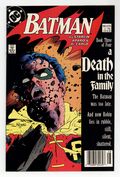 Starts Feb 16 First printing. Newsstand Edition. Cover art by Mike Mignola. "A Death in the Family" part 2 of 4, script by Jim Starlin, pencils by Jim Aparo, inks by Mike DeCarlo; Jason meets his real mother, Sheila Haywood, but she turns out to be working for the Joker and allows her son to fall into his deadly hands inside of a warehouse; Joker beats Robin with a crowbar and leaves him for dead as a badly beaten Robin attempts to save his mom and himself from the dynamite left behind by the Joker as he leaves them both to a horrible fate; Batman watches in horror as the warehouse containing Jason and Sheila blows up, too late to stop the Joker. Infamous Phone Poll on death or life for Robin (Jason Todd). The Direct Sales copies of this comic, released first, contained a 1-800 phone number to either vote "for" or "against" the death of Jason Todd on the inside back cover. The newsstand copies, released 3 weeks later did not contain the 1-800 number. NOTE: Most issues from 397-432 were reprinted in 1989 and sold in multipacks. These 2nd and 3rd prints have back cover ads dated 1989. 52 Pages, Full Color. Cover price $1.50.