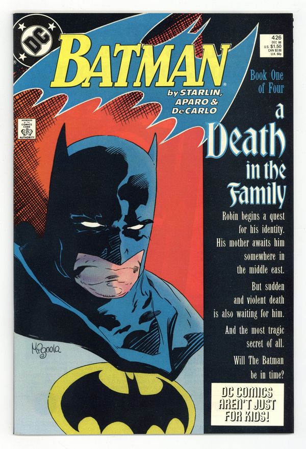 Starts Mar 2 First printing. Direct Edition. Cover art by Mike Mignola. "A Death in the Family" part 1 of 4, script by Jim Starlin, pencils by Jim Aparo, inks by Mike DeCarlo; Jason discovers that his "real" mother was really his step-mother, and his birth mother is still alive; Joker escapes from Arkham and Batman chases him to the Middle East where he runs across Jason looking for one of the women he thinks is his mom. Infamous story where readers called an 800 number, and 'voted' to have Robin killed! Story continues in Batman #427. NOTE: Most issues from 397-432 were reprinted in 1989 and sold in multipacks. These 2nd and 3rd prints have back cover ads dated 1989. 52 Pages, Full Color. Cover price $1.50.