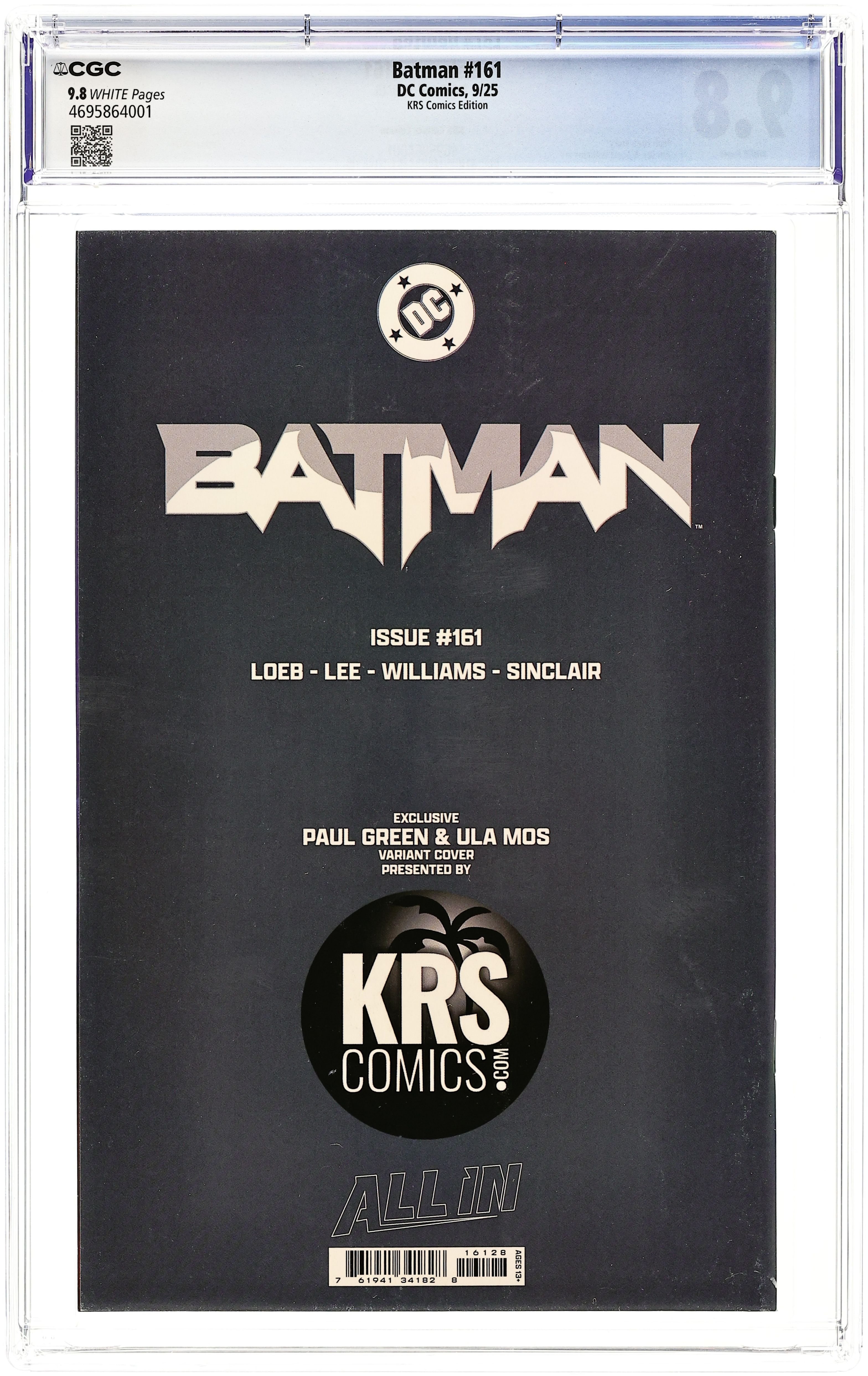 KRS Comics Exclusive Virgin Cover by Paul Green. Written by Jeph Loeb. Art by Jim Lee, Scott Williams. H2SH WITH JEPH LOEB AND JIM LEE PART 4! Batman's battle with Hush takes a dark turn when Damian (Robin) and Bane team up! 40 pages, full color. Rated T+