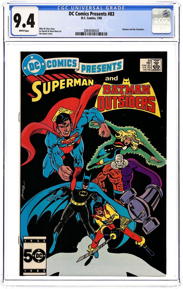 Direct Edition. It's up to Superman, Batman and the Outsiders (Black Lightning, Halo, Geo-Force, Katana and Metamorpho) to take on the Outsider and Ira Quimby (I.Q.) in "Shadow of the Outsider!" Written by Mike W. Barr. Art by Irv Novick & Dave Hunt. Cover by Jim Aparo. Cover price $0.75.