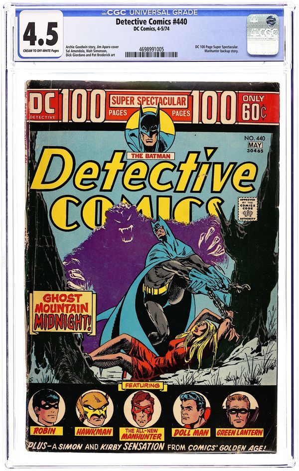100 Page Super Spectacular. Cover art by Jim Aparo. "Ghost Mountain Midnight!", script by Archie Goodwin, pencils by Sal Amendola, inks by Dick Giordano; Bruce Wayne witness the abduction of a young woman from a night club in Gotham City and he tries to rescue her from the kidnappers as Batman. Reprints: "Cobras of the Deep!" starring Martin Manhunter, pencils by Jack Kirby, inks by Joe Simon. "The Fear That Haunted Hawkman," script by Gardner Fox, art by Murphy Anderson; While out taking her dog Penny out for a walk, Shiera Carter witnesses a romantic couple suddenly split up when they girl becomes terribly frightened of the man and runs away; Hawkman battles the Sky-Raiders. "A Million-Dollar Corpse!" starring Doll Man, script by William Woolfolk, art by John Spranger. "Too Many Suspects!" starring Green Lantern (Alan Scott), script by Bob Kanigher, pencils by Alex Toth, inks by Frank Giacoia. "Inside Story of the Outsider!", script by Gardner Fox, pencils by Sheldon Moldoff (ghosting for Bob Kane), inks by Joe Giella; Batman and Robin are sent yet another message from the mysterious villain known as the Outsider, who this time sends coffins with Batman and Robin automatons to deliver the message to Bruce Wayne and Dick Grayson. "Chapter 4 Rebellion!", script by Archie Goodwin, art by Walter Simonson; Origin of the Manhunters (but, not the ones created by the Guardians of the Universe). 100 pgs., full color. Cover price $0.60.