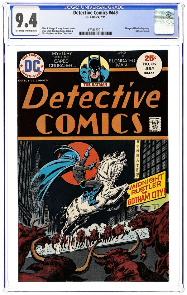Cover by Nick Cardy. "The Night Has a Thousand Fears!", script by Frank Robbins, pencils by Bob Brown, inks by Frank Giacoia; Batman develops a fear of the dark when he accidentally sniffs a packet of drugs a smuggler has planted in Bruce Waynes luggage. "Sign of the Two Fingers!", script by Elliot Maggin, art by Dick Giordano; The Elongated Man tries to solve the mystery of an invisible dog and is forced to commit robbery or see his wife killed. 36 pgs., full color. $0.20. Cover price $0.20.