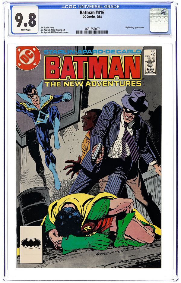 Nightwing (the former Robin) confronts Batman about his decision to take on a new sidekick in "White Gold And Truth". Script by Jim Starlin, pencils by Jim Aparo, inks by Mike DeCarlo. Aparo/Bill Sienkiewicz cover. 1st printing. NOTE: Most issues from 397-432 were reprinted in 1989 and sold in multipacks. These 2nd and 3rd prints have back cover ads dated 1989. 36 Pages, Full Color. Cover price $0.75.
