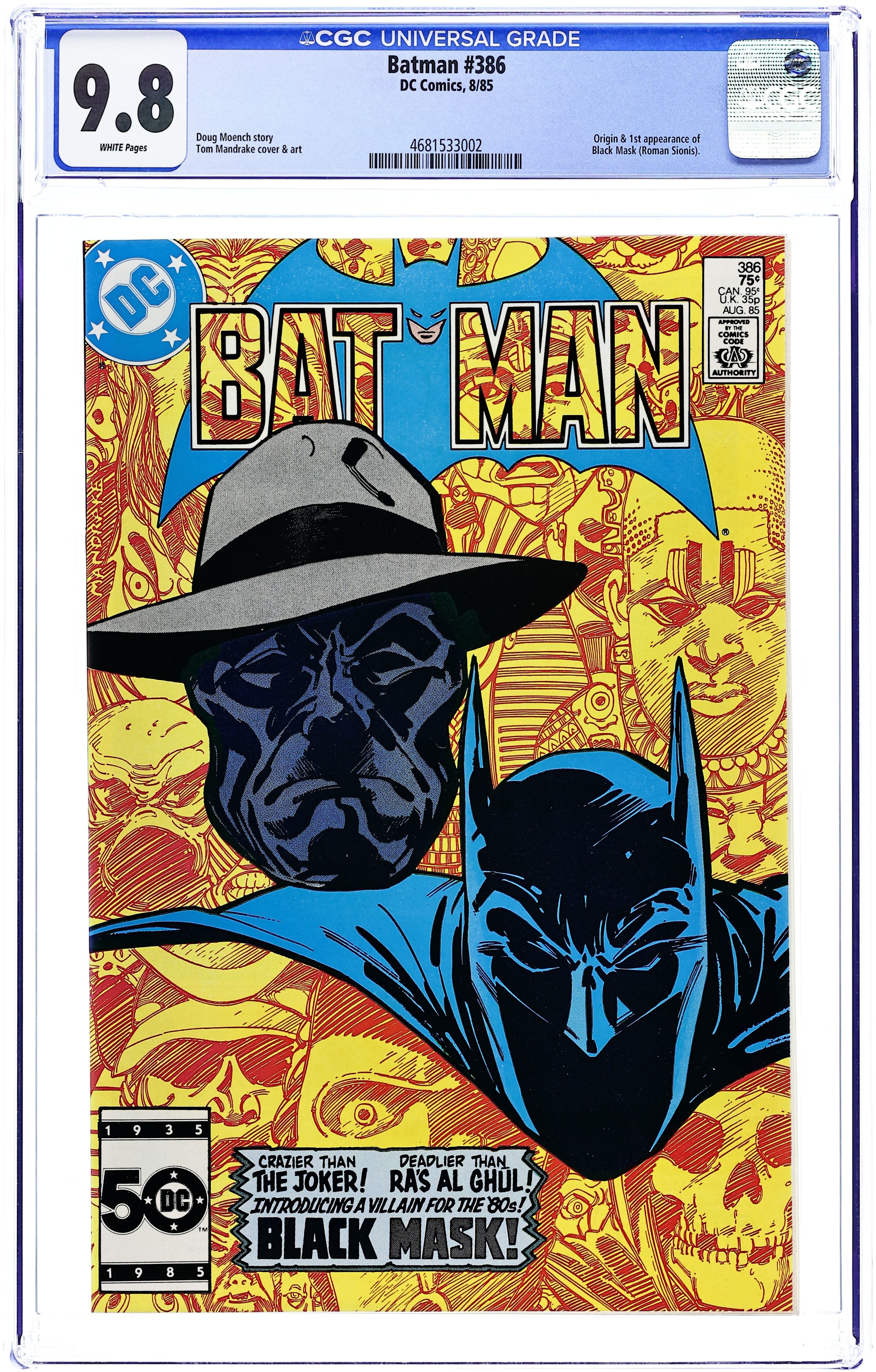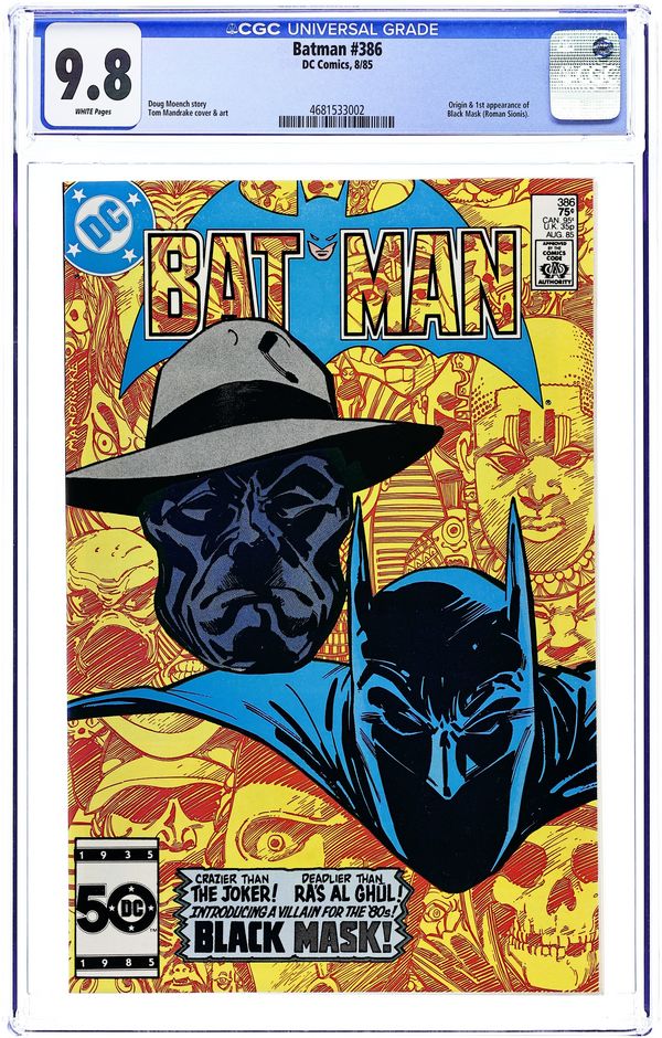 Newsstand Edition. Cover by Tom Mandrake. "Black Mask: Losing Face" starring Batman, Commissioner Gordon, Harvey Bullock, Black Mask (1st appearance and origin), and Lucius Fox, script: Doug Moench, art by Tom Mandrake; Roman Sionis loses his family's company, Janus Cosmetics, and turns to a life of crime as Black Mask. Part 1 of 3, continued in Detective Comics (1937) #553. Missive by letter hack T.M. Maple. 36 Pages, Full Color. Cover price $0.75.