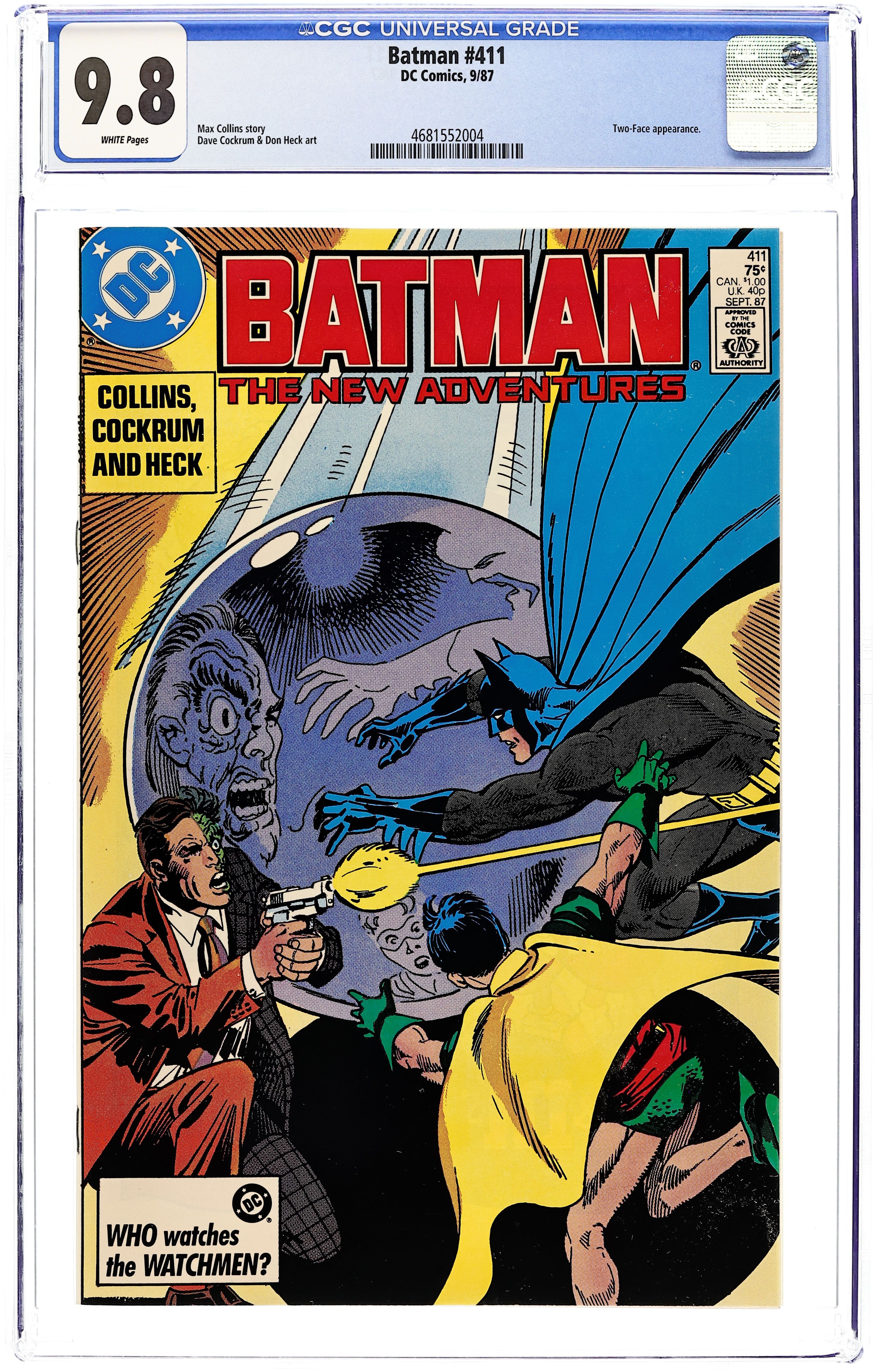 Jason Todd origin, part 2 of 2. In "Second Chance", Jason Todd's connection to Two-Face causes Todd to lose control. Part 2 of 2, continued from the previous issue. Script by Max Allan Collins, pencils by Dave Cockrum, inks by Don Heck. 1st printing. NOTE: Most issues from 397-432 were reprinted in 1989 and sold in multipacks. These 2nd and 3rd prints have back cover ads dated 1989. 36 Pages, Full Color. Cover price $0.75.