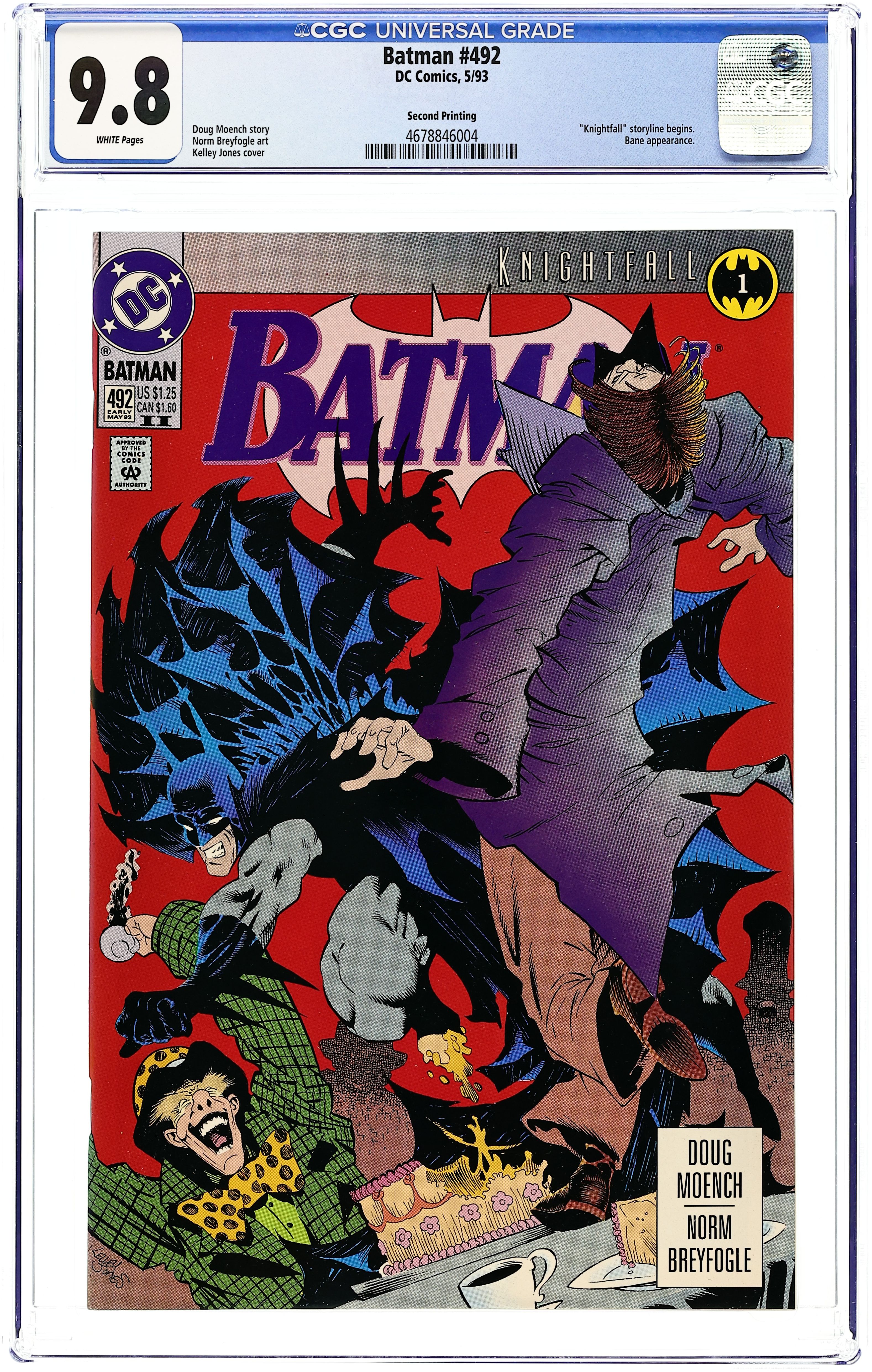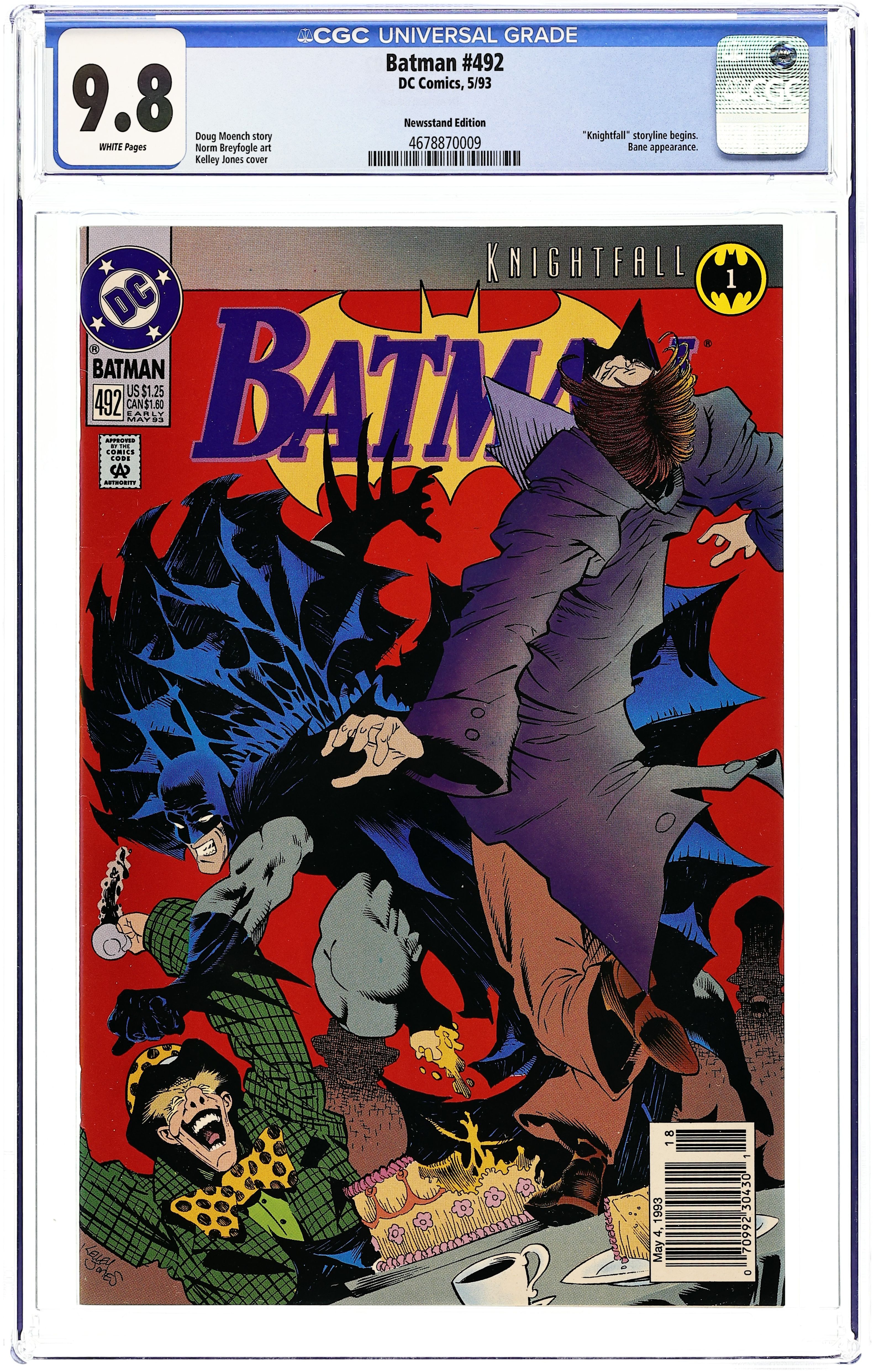 First Printing. Newsstand Edition. KnightFall Part 1. The Mad Hatter invites Batman and Robin to a deadly tea party, while Bane contends with a nosy Film Freak in "Crossed Eyes and Dotty Teas." KnightFall continues in Detective Comics (1937- ) #659. Written by Doug Moench. Art by Norm Breyfogle. Cover by Kelley Jones. 36 Pages, Full Color. Cover price $1.25.