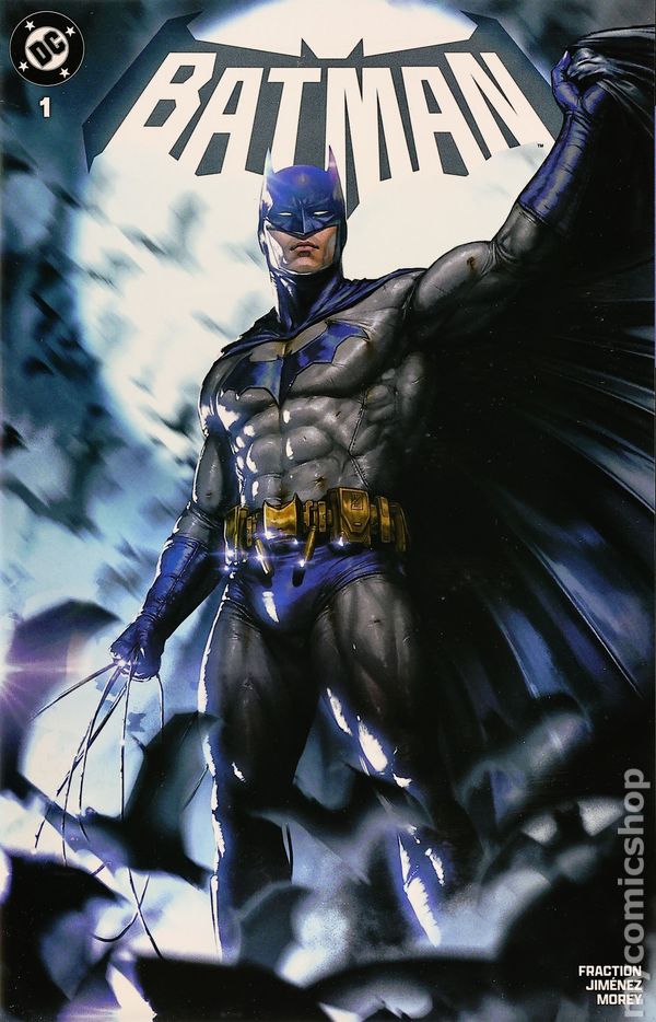 Blind bag foil variant. Written by Matt Fraction. Art by Jorge Jimenez. Cover by Marc Silvestri. A BOLD NEW ERA OF BATMAN STARTS HERE! A new day dawns for the Dark Knight Detective as Eisner Award-winning writer Matt Fraction (Hawkeye, Superman's Pal Jimmy Olsen) joins forces with superstar artist Jorge Jimenez (Batman, Summer of Superman Special) for an unforgettable new era of Batman! The best superhero in comics gets a brand-new first issue to kick off this new era that will test Batman and Bruce Wayne like never before! 40 pages, full color. Rated T+ Cover price $5.99.