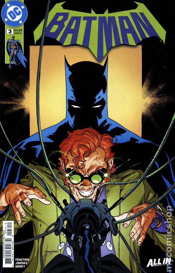 (W) Matt Fraction (A) Jorge Jimenez (CA) Jorge Jimenez FRACTION AND JIMENEZ TAKE THINGS TO A WHOLE NEW LEVEL AS THEIR THRILLING NEW RUN ON BATMAN CONTINUES! Vandal Savage makes his move against Batman and Robin, Bruce Wayne tries to make amends, and the Riddler makes his play for arguably the most important item in all of Gotham. Fraction and Jimenez take things to a whole new level as their thrilling new run on Batman continues! 32 pages, full color, rated 13+. Cover price $4.99.