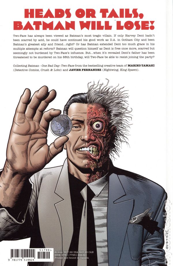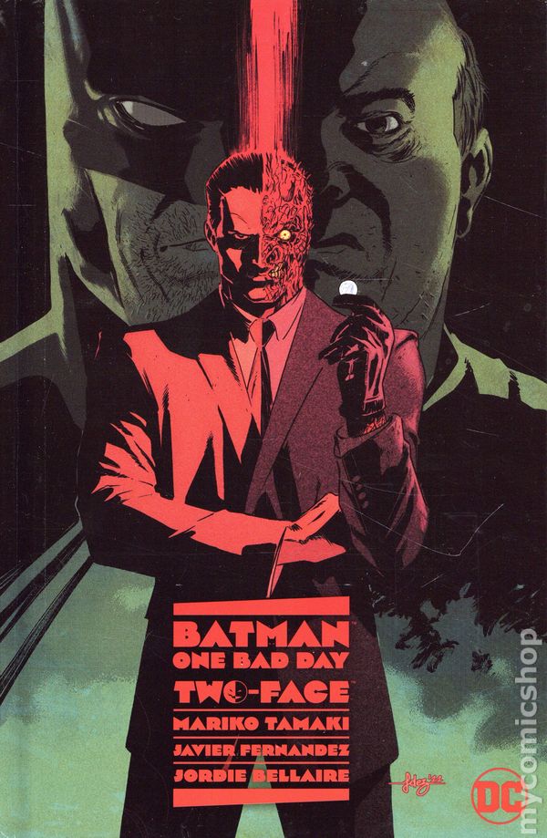 2nd and later printings. Written by Mariko Tamaki. Art and Cover by Javier Fernandez. HEADS OR TAILS, BATMAN WILL LOSE. Two-Face has always been viewed as Batman's most tragic villain. If only Harvey Dent hadn't been scarred by acid, he could have continued his good work as D.A. in Gotham City and been Batman's greatest ally and friend...right? Or has Batman extended him too much grace in his multiple attempts at reform? Batman will question himself as Dent is free once more, still scarred but seemingly free of Two-Face's influence. But when it's revealed that Harvey's father has been threatened to be murdered on his 88th birthday, will Two-Face be able to resist joining the party? Collecting BATMAN: ONE BAD DAY - TWO-FACE #1, from the bestselling creative team of Mariko Tamaki (Detective Comics, Crush & Lobo) and Javier Fernandez (Nightwing, King Spawn). Hardcover, 88 pages, full color. Rated T+ Cover price $17.99.