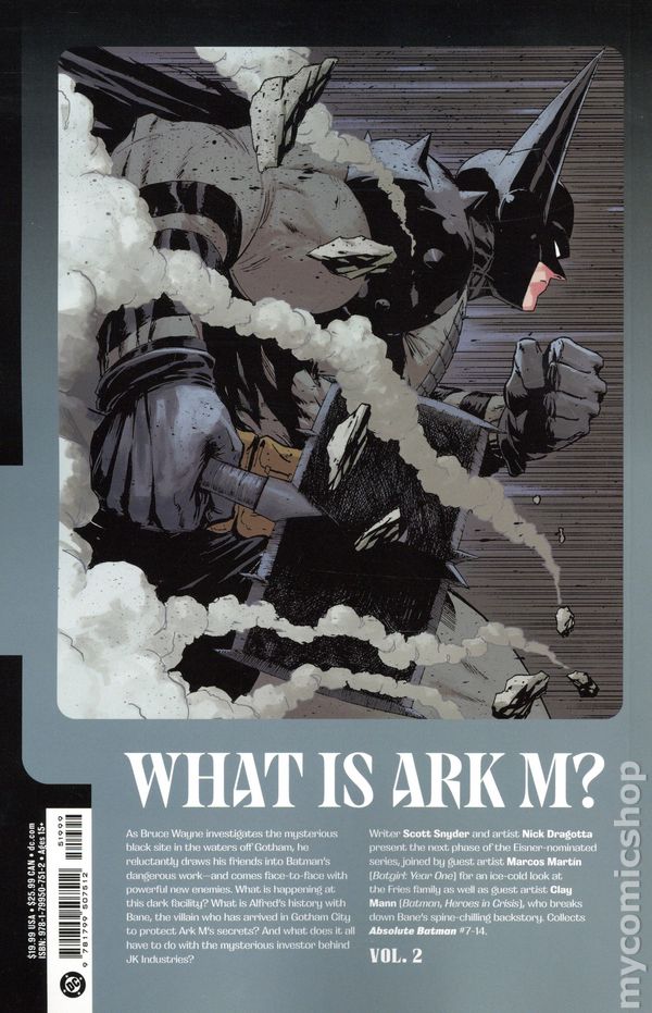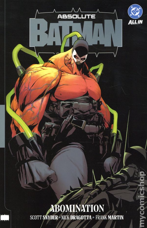 Volume 2 - 1st printing. "Abomination!" Collects Absolute Batman (2024 DC) #7-14. Written by Scott Snyder. Art by Nick Dragotta, Marcos Martin, and Clay Mann. Cover by Nick Dragotta. DON'T MISS THE SECOND VOLUME OF SCOTT SNYDER AND NICK DRAGOTTA'S GROUNDBREAKING BATMAN EPIC! As Bruce Wayne investigates the mysterious black site known as Ark M, he reluctantly draws his friends into Batmans dangerous work--and comes face-to-face with powerful new enemies. What is happening at this dark facility? What is Alfreds history with Bane, the villain who has arrived in Gotham City to protect Ark Ms secrets? And what does it all have to do with the mysterious Joker? Hardcover, 240 pages, full color. Teen+ Cover price $29.99.