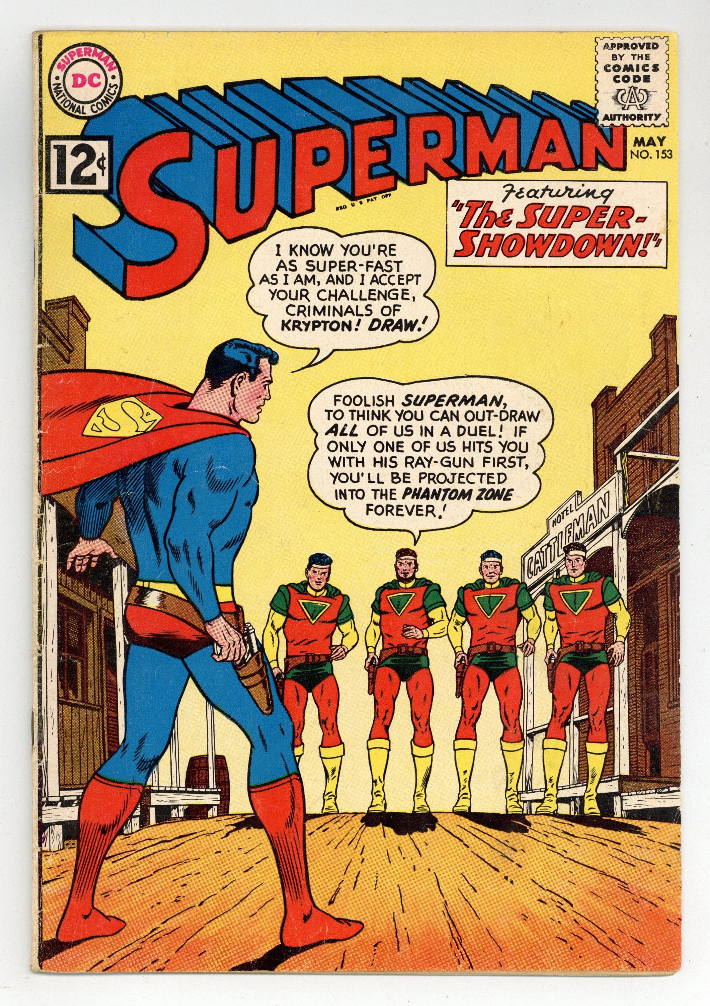 Starts Jan 19 Cover pencils by Curt Swan, inks by George Klein. The Day Superman Broke the Law!, art by Al Plastino; Councilman Finch has Superman arrested for tiny infractions of the law so he will be in jail and unable to prevent his theft from the bank. The Secret of the Superman Stamp!, pencils by Curt Swan, inks by George Klein; The city of Rangoon wants a photo of Superman for a new postage stamp. The Town of Supermen!, script by Jerry Siegel, art by John Forte; Lois Lane is invited to a ghost town by eight escaped Phantom Zone criminals in a plot to capture Superman. 36 Pages, Full Color. Cover price $0.12.