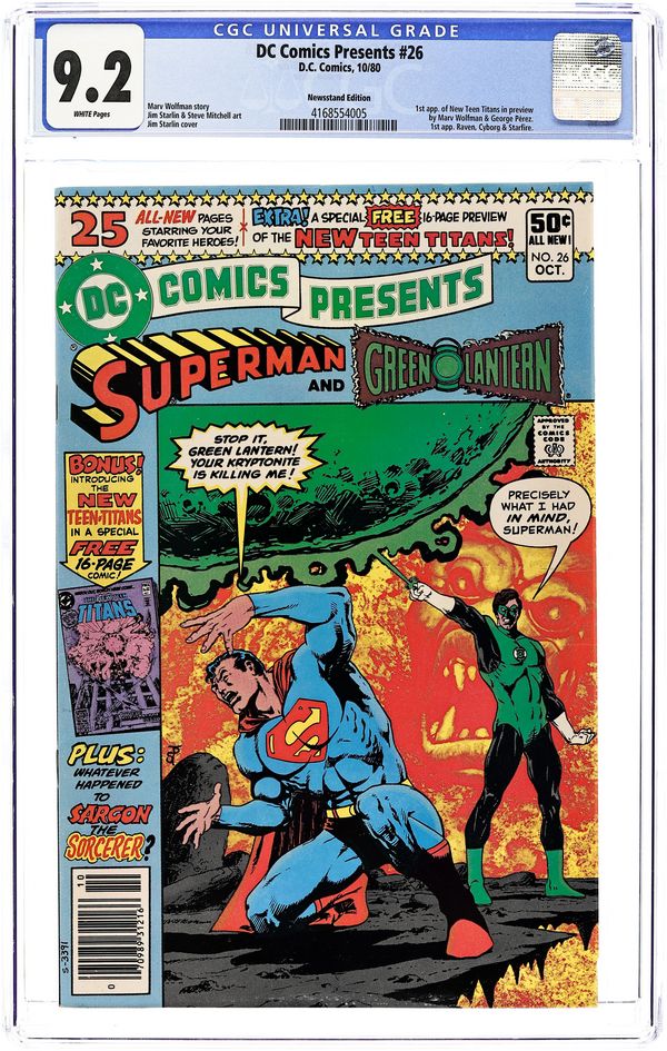 Direct Edition. 1st appearance of the New Teen Titans in preview story; 1st appearances of Raven, Cyborg and Starfire. Cover by Jim Starlin. Stories by Jim Starlin, Marv Wolfman and Bob Rozakis. Art by Jim Starlin, George Pérez, José Delbo, Steve Mitchell, Dick Giordano and Kim DeMulder. N'Gon is attempting to gain power by taking it from other super-beings, but Superman and Green Lantern combine forces to imprison N'Gon in "Between Friend and Foe!" by Jim Starlin (plot and pencils), Marv Wolfman (script) and Steve Mitchell (inks). Characters in this story: Green Lantern [Hal Jordan]; Superman [Clark Kent]; Green Lantern [Archon Z'Gmora]; N'Gon (villain); Archie Jones. Plus: Raven uses her powers to enter Dick Grayson's dreams to show him a scene from the not-too-distant future of the new Teen Titans team battling to save the world from an other-dimensional protoplasmic creature in "Where Nightmares Begin!" by Marv Wolfman, George Pérez and Dick Giordano. Characters in this story: Teen Titans [Changeling [Garfield Logan] (introduction as Changeling); Cyborg [Victor Stone] (introduction); Kid Flash [Wally West]; Raven (introduction); Robin [Dick Grayson]; Starfire [Koriand'r] (introduction); Wonder Girl [Donna Troy]]; Silas Stone (introduction); an other-dimensional protoplasm (villain). Story continues in New Teen Titans (1980) (Tales of ...) #1. Also: The Matter Master attempts to steal the Ruby of Life but Sargon stops him in the back-up story "Whatever Happened to Sargon the Sorcerer?" by Bob Rozakis, José Delbo and Kim DeMulder. Characters in this story: Justice League of America [The Atom [Ray Palmer] (flashback); Batman [Bruce Wayne] (flashback); The Flash [Barry Allen] (flashback); Green Arrow [Oliver Queen] (flashback); Hawkman [Katar Hol/Carter Hall] (flashback); Superman [Clark Kent] (flashback); Wonder Woman [Diana Prince] (flashback)]; The Matter Master [Mark Mandrill] (villain); Sargon the Sorcerer [John Sargent]. And: Hawkman vs. Golden Raven in 1-page Hostess Fruit Pies ad "She's No Angel" with pencils by Curt Swan. 48 pages, full color. Cover price $0.50.