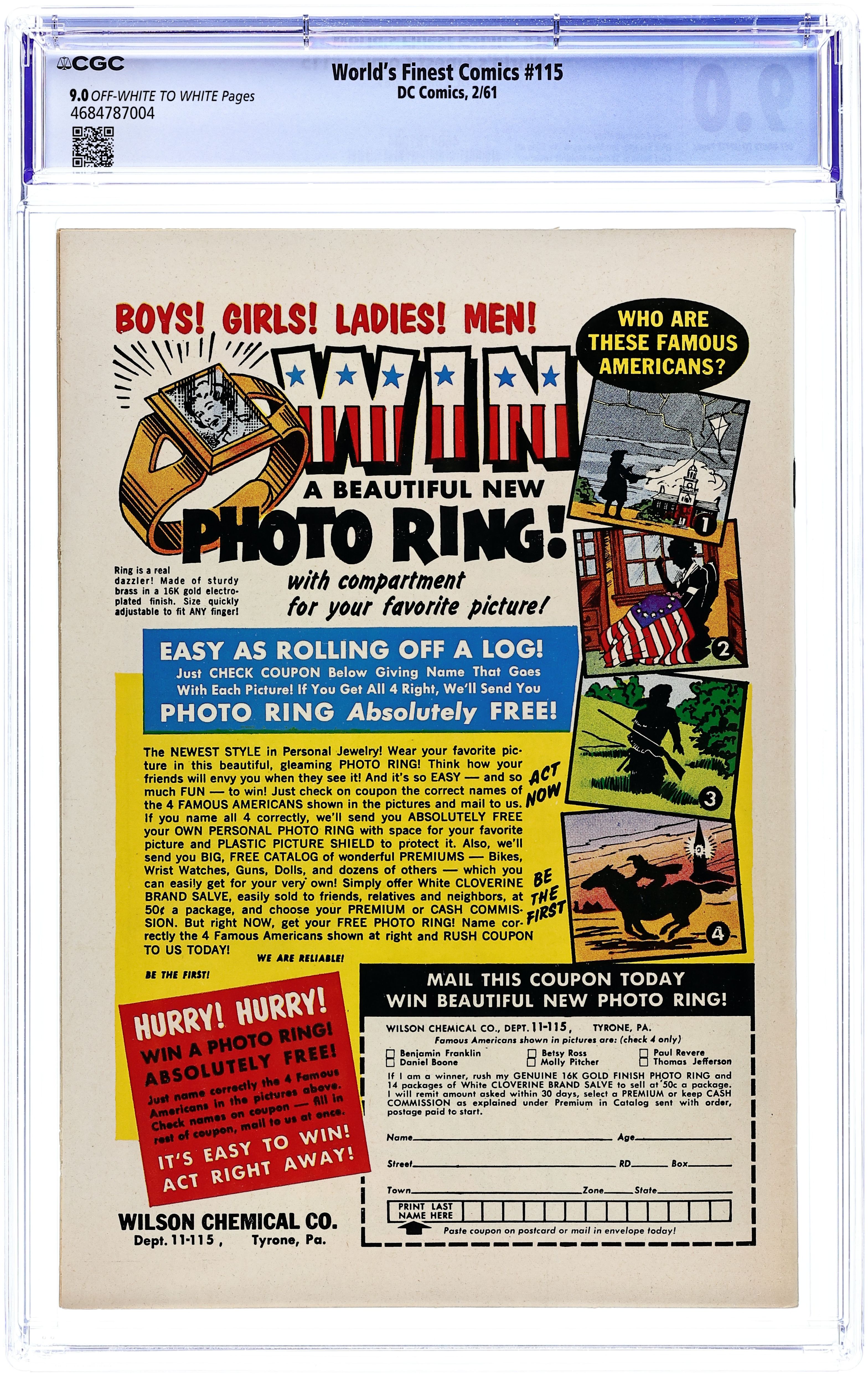Cover pencils by Curt Swan, inks by Sheldon Moldoff. Part I- The Clash of Cape and Cowl starring Superman and Batman, script by Edmond Hamilton, pencils by Curt Swan, inks by George Klein; Young Bruce Wayne is convinced that Superboy killed his father and vows to become Batman so he can bring him to justice. Part II--The Death of a Hero. Warden Willis humor page by Henry Boltinoff. The Boy Who Changed the Future--Editors' Round Table, script by John Broome, pencils by Bob Oksner, inks by Bernard Sachs. 36 Pages, Full Color. Cover price $0.12.