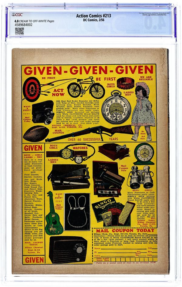 Cover pencils by Curt Swan, inks by Stan Kaye. "Superman's New Face," script by Edmond Hamilton, pencils by Wayne Boring, inks by Stan Kaye; Superman is caught in an atomic explosion and afterwards must bandage his face, or wear a lead mask, to keep anyone from seeing what happened to him. One-page Tricksy the World's Greatest Stunt Man story by Henry Boltinoff. "The Puzzle of the Jungle Pyramid!" starring Congo Bill, art by Howard Sherman. Untitled Jerry the Jitterbug story by Henry Boltinoff. Untitled Casey the Cop story by Henry Boltinoff. "The Toys That Stopped Space Crime" starring Tommy Tomorrow, script by Otto Binder, art by Jim Mooney. 36 Pages, Full Color. $.10 Cover price $0.10.