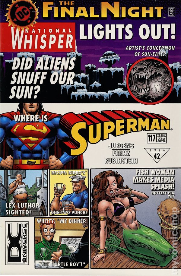 "From the Heart!" Guest-starring Wonder Woman. Story by Dan Jurgens. Art by Ron Frenz and Joe Rubinstein. In the aftermath of the Sun-Eaters attack (see Final Night (1996) #1-4), Superman remains powerless. As S.T.A.R. Labs tries to find a way to return his powers, Clark gets some much needed relationship advise from his close friend, Wonder Woman. Meanwhile, the woman in question, Lois Lane continues her adventures abroad. Cover price $1.95.
