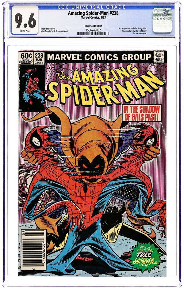 IMPORTANT: Issue 238A HAS the Lakeside Skin Tattooz insert. Newsstand Edition. First appearance of the Hobgoblin in "Shadow of Evils Past!" Script by Roger Stern. Art by John Romita Jr. (breakdowns) and John Romita Sr. (finishes). Cover by John Romita Jr. and John Romita Sr. One of the landmark issues of the Amazing Spider-Man! And the beginning of the long secret identity mystery of the Hobgoblin! After escaping from the web-slinger, a bank robber stumbles upon an underground hideout of the (deceased) Green Goblin! Not knowing what to do with his discovery, the small-time hood shows the secret lair to an underworld associate! Unfortunately for the wondrous wall-crawler, the devious associate knows exactly what to do: resurrect the Green Goblin...with a twist! And a short time later a new super-villain is born! The Hobgoblin! Cameo appearance by Mary Jane Watson. Flashback cameo by Norman Osborn (aka the Green Goblin). (Notes: The secret identity of the original Hobgoblin takes many twists and turns over the next decade. Who actually operates as the Hobgoblin in this issue is revealed in the Spider-Man: Hobgoblin Lives (1997) Limited Series (written by Roger Stern). This issue was reprinted in Marvel Tales 257 and also in the 1992 trade paperback: the Amazing Spider-Man -- Origin of the Hobgoblin.) 36 pages. Cover price $0.60.