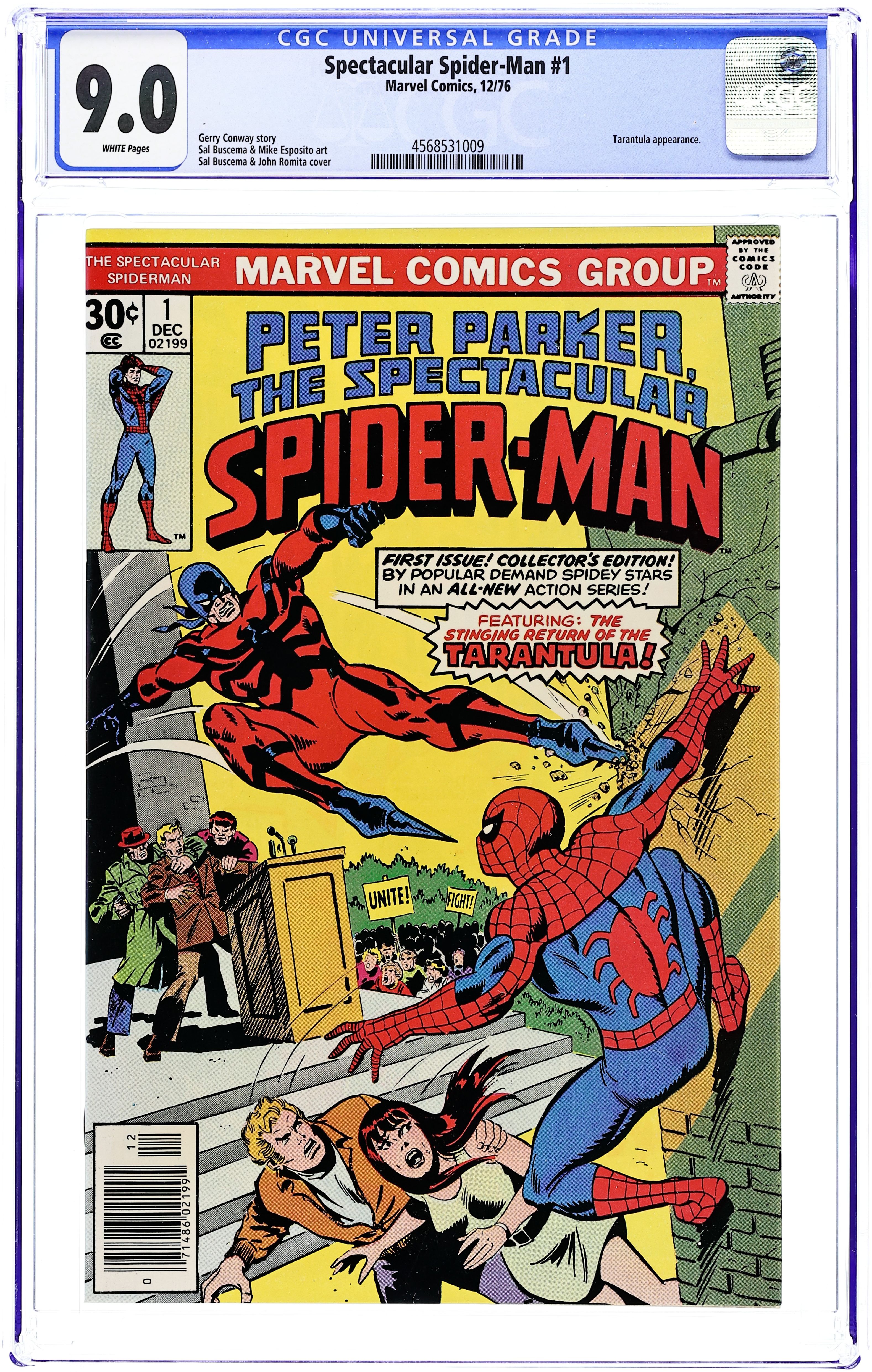 Ends Mar 2 9:18 PM CST Bid History 4 bids Current Bid $45 Your Secret Max Bid If you'd like to bid, please log in or register. "Twice Stings The Tarantula!" Part 1 of 3. Script by Gerry Conway. Pencils by Sal Buscema. Inks by Mike Esposito. Cover by Sal Buscema and John Romita. The first issue of a brand new series for Spider-Man! The story opens with a bang as the Tarantula kidnaps the Empire State University vice-chancellor, despite the best efforts of the web-slinger, Flash Thompson, and Mary Jane Watson! Next, the Tarantula tries to kill the mayor, but this time the Spectacular Spider-Man is ready! Can the wall-crawler beat the Tarantula and save Mayor Abe Beame? First appearance of Edward Lansky (aka Lightmaster). (Notes: The Spectacular Spider-Man series became the third monthly title for Spider-Man. The first issue of the series debuted the same month as Amazing Spider-Man 163 and Marvel Team-Up 52. The letters page contains an essay from Gerry Conway describing the plans for the new Spider-Man title.) 32 pages Cover price $0.30.