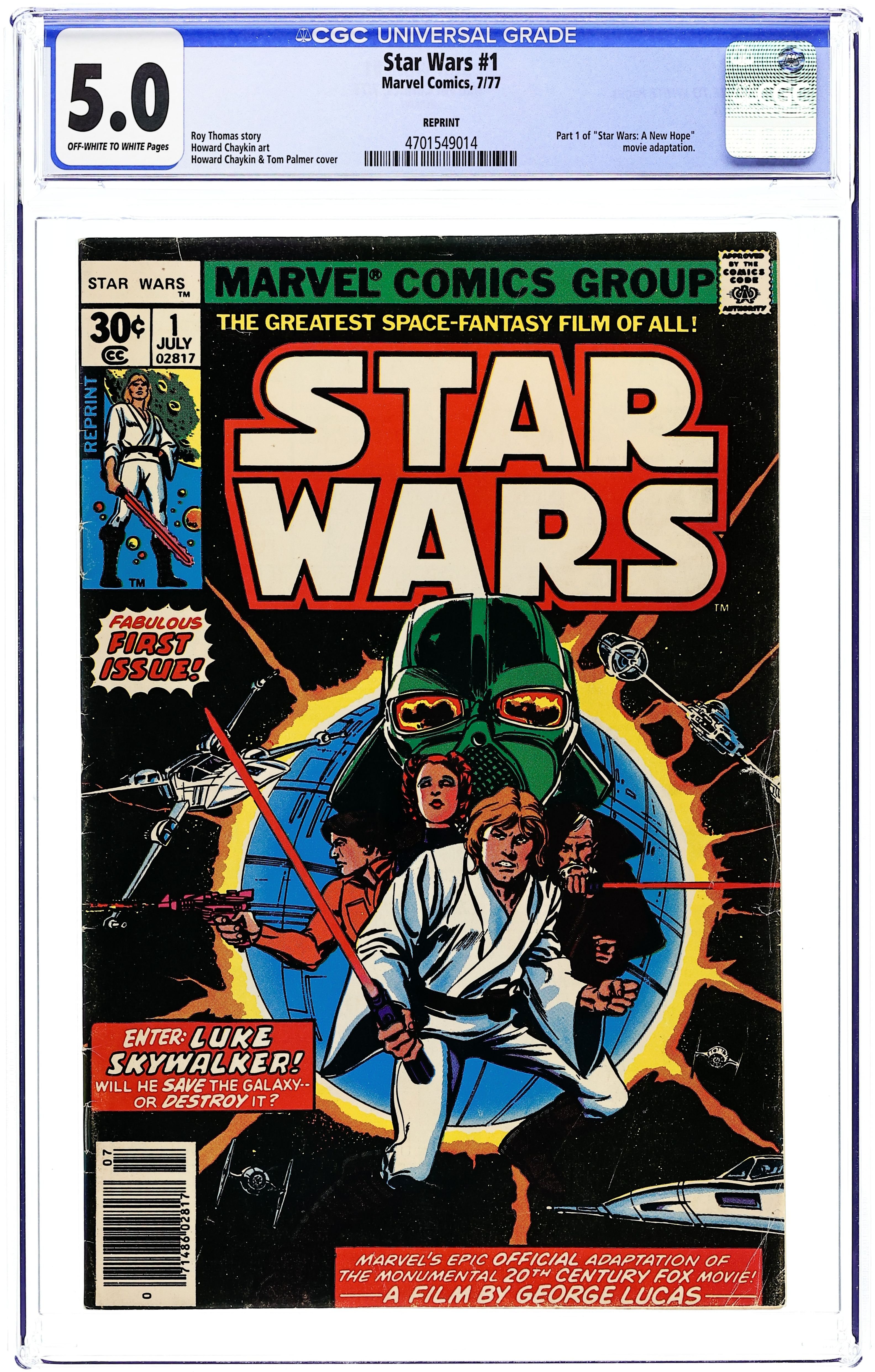 Ends Apr 15 7:56 PM CST Bid History 15 bids Current Bid $2,550 Your Secret Max Bid If you'd like to bid, please log in or register. 1st printing, standard 30 Cent Newsstand Edition with UPC. "A New Hope!" Part 1 of 6. Based on the screenplay by George Lucas. Adapted by Roy Thomas. Art by Howard Chaykin and Steve Leialoha.
