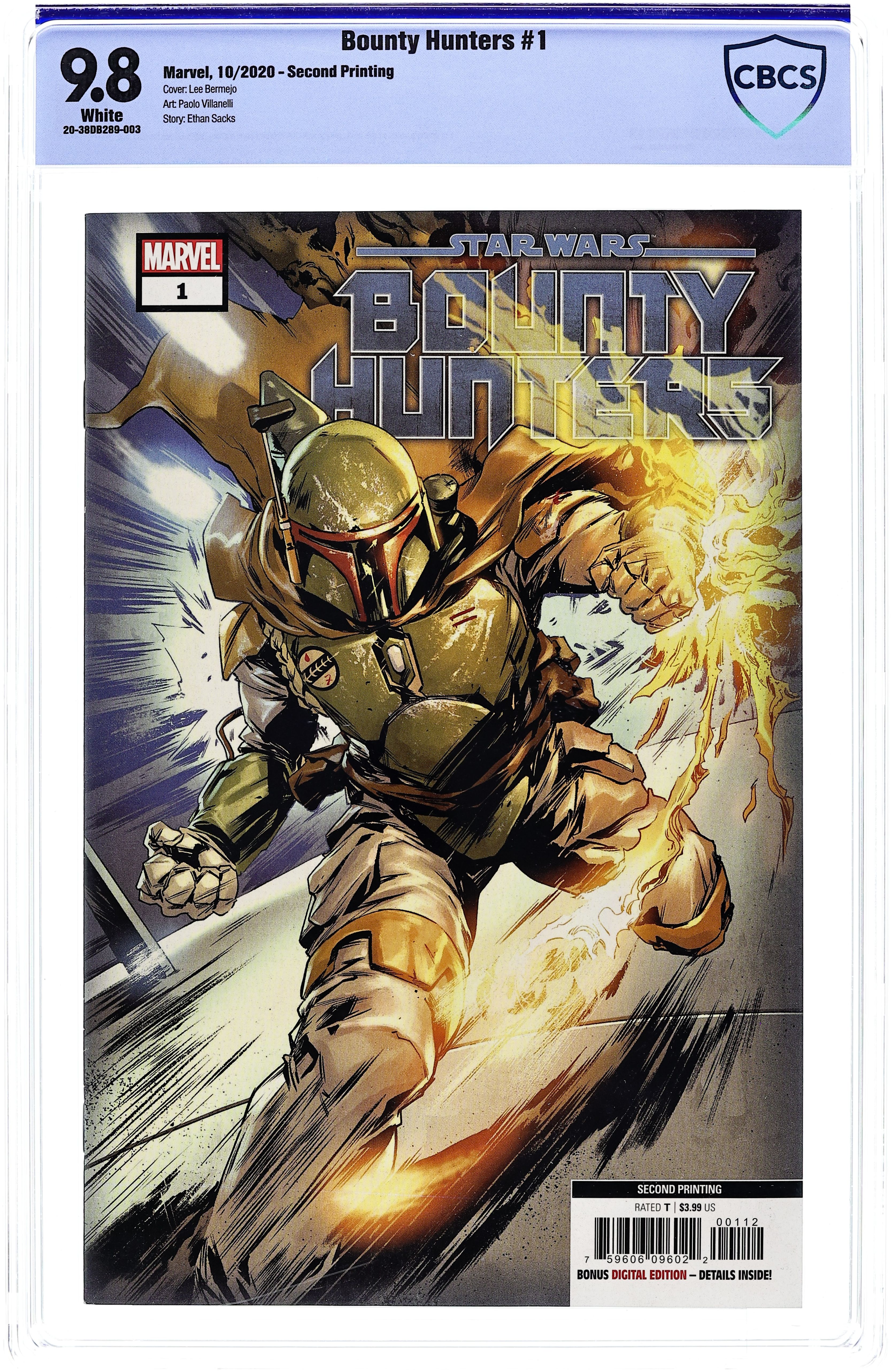 2nd Printing. Written by Ethan Sacks. Art and Cover by Paolo Villanelli. NEVER BETRAY A BOUNTY HUNTER - ESPECIALLY IF IT'S BOBA FETT! Years ago, VALANCE and fellow bounty hunters BOSSK and BOBA FETT took on a mission that went sideways in a bad way after Valance's mentor, NAKANO LASH, violently betrayed them. Valance's team barely escaped with their lives. He never thought he'd face his old mentor ever again…until Lash finally resurfaces under mysterious circumstances. Every bounty hunter in the galaxy wants a piece and Valance is hell-bent on getting to the prize first. He has score to settle-but so does Boba Fett! 28 pages, full color. Rated T Cover price $3.99.