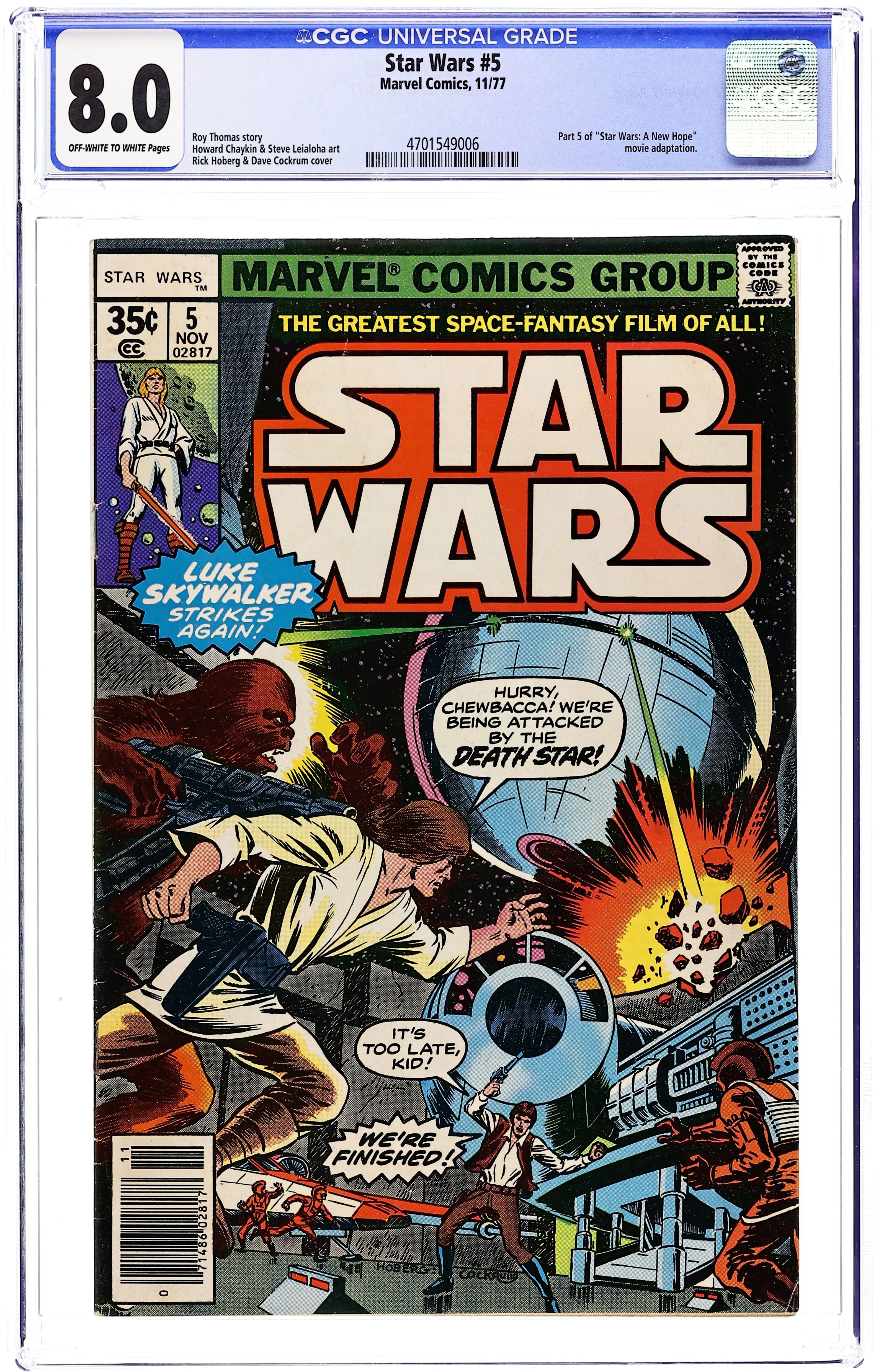 Ends Apr 15 7:58 PM CST Bid History 10 bids Current Bid $59 Your Secret Max Bid If you'd like to bid, please log in or register. 1st printing, standard 30 Cent Newsstand Edition with UPC. A New Hope: Part 2 of 6. "Six against the Galaxy!" Based on the screenplay by George Lucas. Adapted by Roy Thomas. Art by Howard Chaykin and Steve Leialoha. Princess Leia is in the hands of the evil Empire and the sinister Darth Vader. Now it falls on farm boy Luke Skywalker to seize his destiny and rescue her, and save the galaxy. But he can't do it alone. Luckily he'll get some help from old Ben Kenobi, once a great Jedi Knight known as Obi-Wan, Han Solo, a cocky ace pilot and all around scoundrel, Chewbacca, the hulking wookie and loyal co-pilot to Han, and the droids who hold the key to the Empire's defeat, C-3PO and R2-D2. NOTE: Spider-Man stas in a one-page Hostess ad, "Madam Web!" Cover price $0.30.