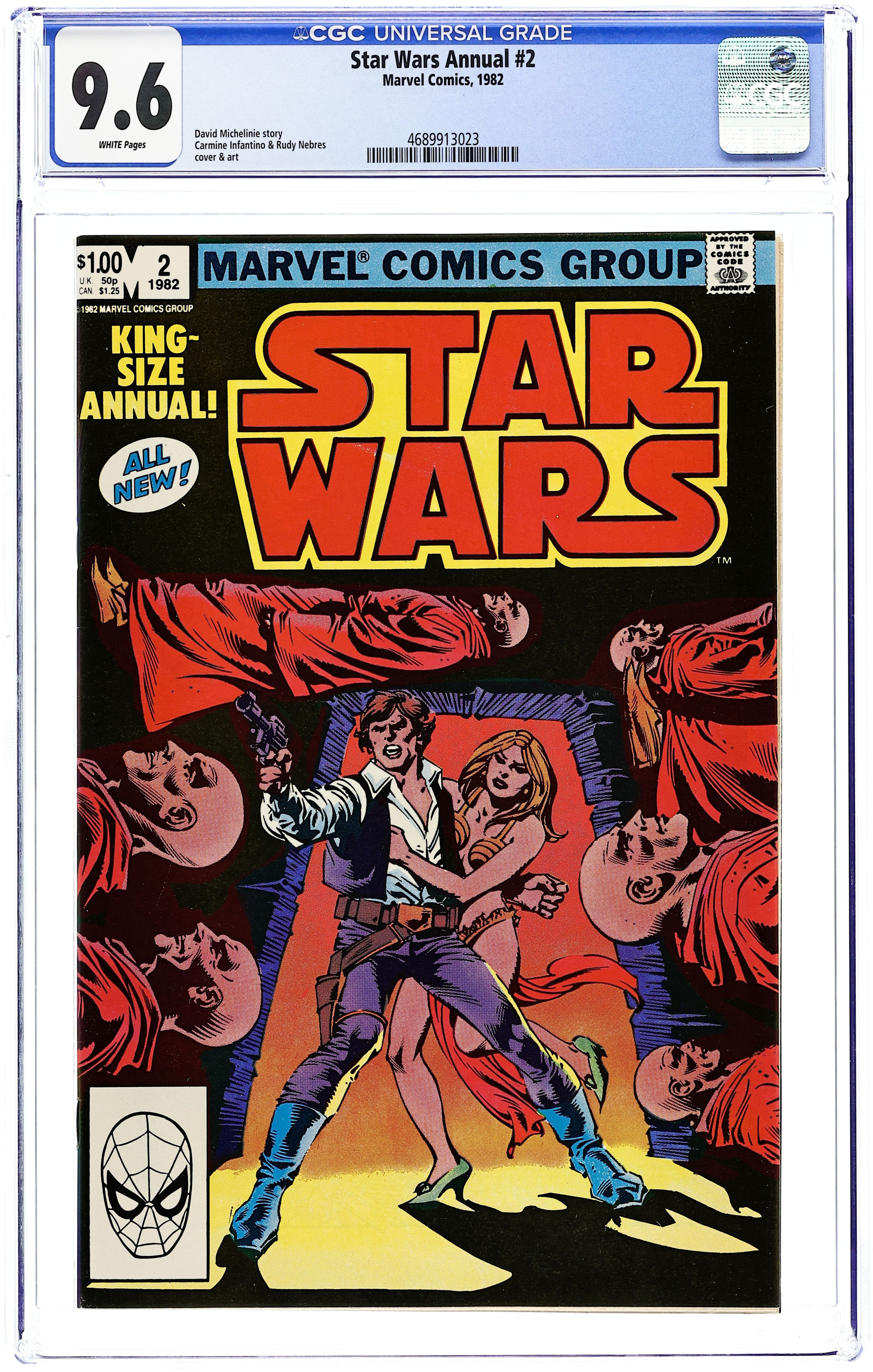 Direct Edition. Shadeshine! - Written by David Michelinie. Art and Cover by Carmine Infantino and Rudy Nebres. Characters in this king-size annual: C-3PO; Lando Calrissian; Chewbacca; Luke Skywalker; Han Solo; Vetter Piin; Satab; Chrysalla; Plodgett; Phalaf. 48 pages, full color. Cover price $1.00.