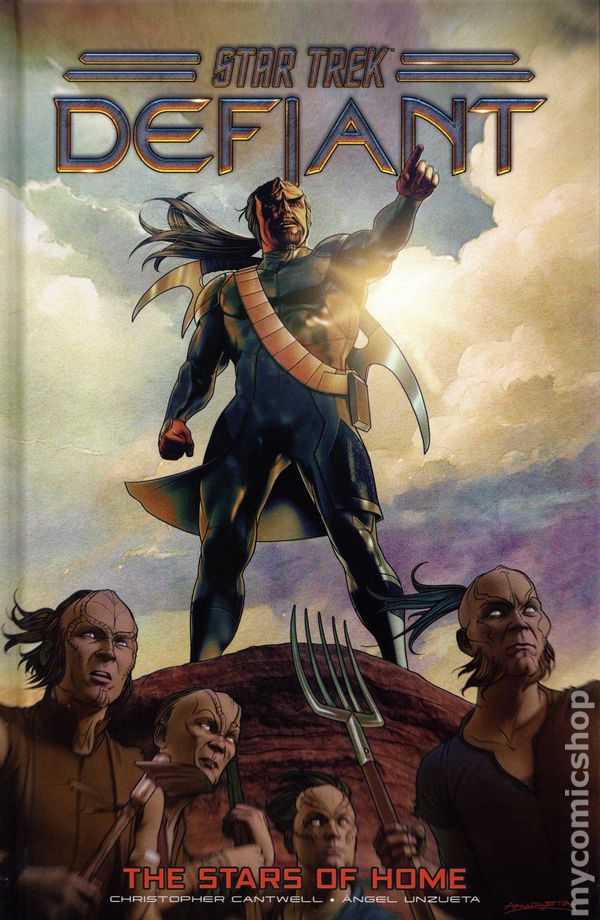Volume 1 - 1st printing. Collects Star Trek Defiant (2023 IDW) #1-6. Written by Christopher Cantwell. Art and cover by Angel Unzueta. Back Cover by Declan Shalvey. Someone is killing the gods. But Benjamin Sisko's Prophets-guided dealings of the higher cosmos has led him to forget about the very real casualties on lower ground. But who is this new enemy? Worf of House Martok has put together his own crew aboard the USS Defiant in hopes of defeating the dangerous messiah behind this genocidal cult. The Dirty Dozen meets Star Trek in this new series from the creative minds of Chris Cantwell and Angel Unzueta! Softcover, 144 pages, full color. Cover price $24.99.
