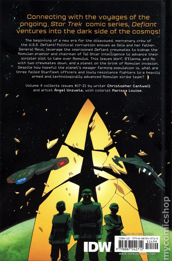 Volume 4 - 1st printing. "The Stars of Home!" Collects Star Trek: Defiant (2023 IDW) #17-21. Written by Christopher Cantwell. Art and cover by Angel Unzueta. Back Cover by Declan Shalvey. It's the beginning of a new era for the disavowed, mercenary crew of the U.S.S. Defiant! Political corruption ensues as Sela and her father, General Revo, leverage the imprisoned Defiant crewmates to kidnap the Romulan praetor and chairman of Tal Shiar Intelligence to advance their sinister plot to take over Romulus... This leaves Worf, B'Elanna, and Ro with two crewmates down, and a planet on the brink of Romulan invasion. Despite how hopeful the planet's meager farming population is, what are three failed Starfleet officers and lowly resistance fighters to a heavily armed and technologically advanced Romulan strike team? Softcover, 144 pages, full color. Cover price $24.99.