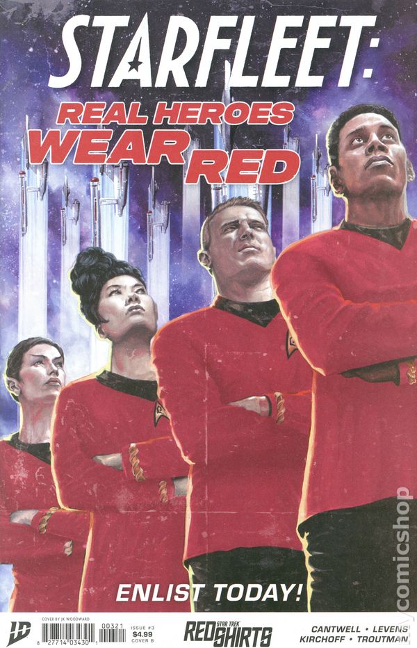 Written by Christopher Cantwell. Art by Megan Levens. Cover by J.J. Lendl. The start of an all-new heartrending Star Trek five-issue miniseries by writer Christopher Cantwell (Star Trek: Defiant) and artist Megan Levens (Star Trek), featuring Starfleets most intrepid and doomed crewmembers: red shirts. Now, finally, they get their own story.Led by an experienced officer embedded on the snow-ridden planet Arkonia 89, the crew of the U.S.S. Warren has a small window in which to pin down spies seeking to steal classified secrets and keep Starfleet data out of their nefarious hands.They face threats not only from their faceless enemies but from the brutalizing elements and wildlife of a planet far from home. The red shirts lives and Starfleets sanctity are on the line…and no one is safe. 28 pages, full color. Cover price $4.99.