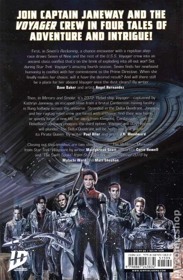 1st printing. Collects Star Trek: Voyager - Seven's Reckoning (2020 IDW) #1-4, Star Trek: Voyager - Mirrors And Smoke (2019 IDW), and Stories from Star Trek: Waypoint (2016 IDW) #3 and Star Trek: Waypoint Special (2018 IDW) #2. Written by Dave Baker., Paul Allor, Mairghread Scott, Malachi Ward, and Matt Sheehan. Art by Angel Hernandez, J. K. Woodward, Corin Howell, and Malachi Ward. Cover by Jake Bartok. Back Cover by J. K. Woodward. Join Captain Janeway and the Voyager crew in four tales of adventure and intrigue! First, in Sevens Reckoning, a chance encounter with a reptilian alien race draws Seven of Nine and the rest of the U.S.S. Voyager crew into an ancient class conflict that's on the brink of exploding into all-out war! Set during Star Trek: Voyager's amazing fourth season, Seven finds her newfound humanity in conflict with her commitment to the Prime Directive. When she finally makes her choice, will it have the desired result? And will there still be a place for her aboard Voyager once the dust clears? By writer Dave Baker and artist Angel Hernandez. Then, in Mirrors and Smoke, its 2372. Rebel ship Voyager—captained by Kathryn Janeway, an escaped slave from a brutal Cardassian mining facility—is flung halfway across the universe. Stranded in the Delta Quadrant, Janeway and her ragtag rebel crew are faced with a choice: find their way home, or quietly forge a new life far away from Klingons, Cardassians, and the Rebellion? Janeway chooses the third option. Voyager will stay. Voyager will plunder. The Delta Quadrant will be hers, and she will be its Pirate Queen. By writer Paul Allor and artist J.K. Woodward. Closing out this omnibus are two short stories, The Wildman Maneuver from Star Trek: Waypoint by writer Mairghread Scott and artist Corin Howell and The Swift Spoke from Star Trek: Waypoint Special 2019 by Malachi Ward and Matt Sheehan. Softcover, 6-in.x 9-in., 152 pages, full color. Cover price $15.99.