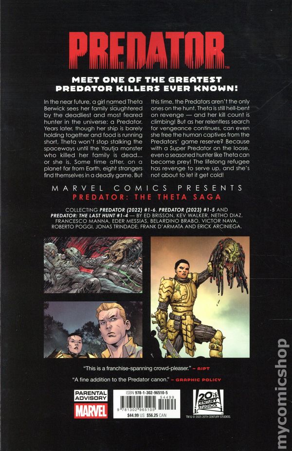 1st printing. Collects Predator (2022 Marvel) #1-6, Predator (2023 Marvel) #1-5 and Predator: The Last Hunt (2024 Marvel) #1-4. Written by Ed Brisson. Art by Kev Walker, Netho Diaz, Francesco Manna, Eder Messias, and Jonas Trindade. Cover by Leinil Yu. Fan favorite author Ed Brisson ushered the PREDATOR franchise into its new era with Marvel, and this volume collects his entire acclaimed saga in one book, starring the all-new character Theta Berwick! In the near future, a girl named Theta Berwick sees her family slaughtered by the deadliest and most feared hunter in the universe: a Predator. Years later, though her ship is barely holding together and food is running short, Theta wont stop stalking the spaceways until the Yautja monster who killed her family is dead...or she is. Some time after, on a planet far from Earth, eight strangers find themselves in a deadly game. But this time, the Predators arent the only ones on the hunt. Theta is still hell-bent on revenge — and her kill count is climbing! But as her relentless search for vengeance continues, can even she free the human captives from the Predators game reserve? Because with a Super Predator on the loose, even a seasoned hunter like Theta can become prey! The lifelong refugee has revenge to serve up, and shes not about to let it get cold! Softcover, 376 pages, full color. Rated T+ Cover price $44.99.