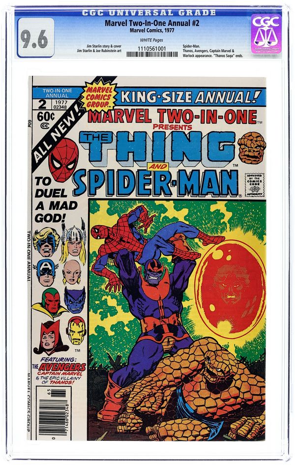 "Death Watch!" Part 2 of 2. Guest-starring Spider-Man, the Thing, Captain Marvel, and the Avengers. Script by Jim Starlin. Art by Jim Starlin (breakdowns) and Joe Rubinstein (finishes). Cover by Jim Starlin. Story continues from Avengers Annual 7. After Captain Marvel, Iron Man, and Thor destroyed Thanos' synthetic power gem, victory appeared close at hand for Earth's Mightiest Heroes. But the evil genius' back up plan has worked to perfection and knocked out the Avengers! Before succumbing to unconsciousness though, Moondragon sends a desperate plea for help back to Earth, specifically to Peter Parker! The web-slinger knows that cosmic battles in outer space are not his specialty, so he swings by the Baxter Building to scoop up a friend. After a quick pow-wow, the blue-eyed idol of millions and your friendly neighborhood Spider-Man blast off to save the galaxy! It's an epic encounter onboard the mad Titan's space ark as the Thing, Thor, Spider-Man, and finally Adam Warlock test their mettle vs. Thanos! Simply a fantastic annual! First appearances of Master Order and Lord Chaos. Avengers Lineup: Beast, Captain America, Iron Man, Scarlet Witch, Thor, and the Vision. (Note: Besides a surreal appearance in the Death of Captain Marvel Graphic Novel (1982), Thanos does not appear again until Silver Surfer (2nd series) #34 thirteen years later.) 48 pages Cover price $0.60.