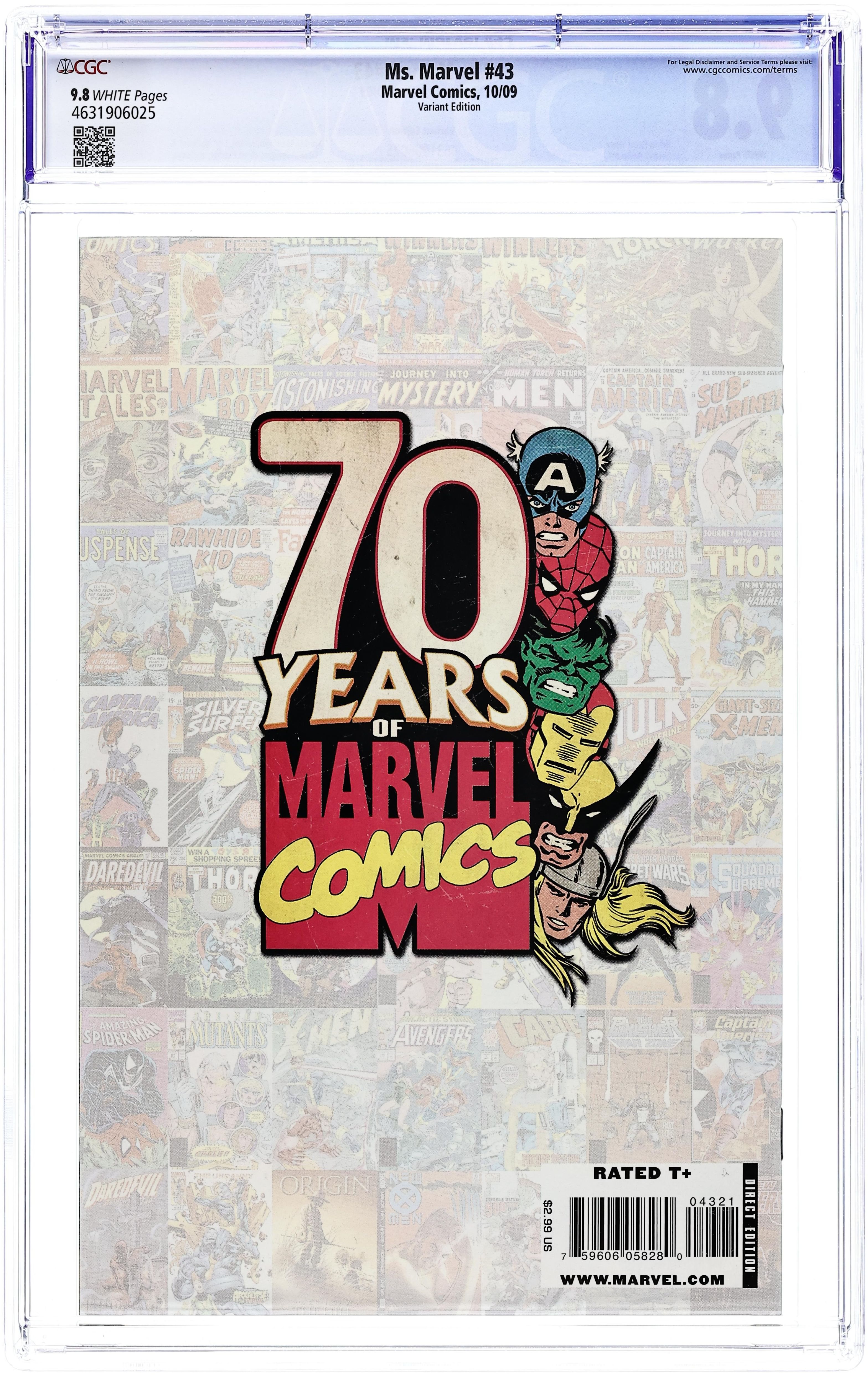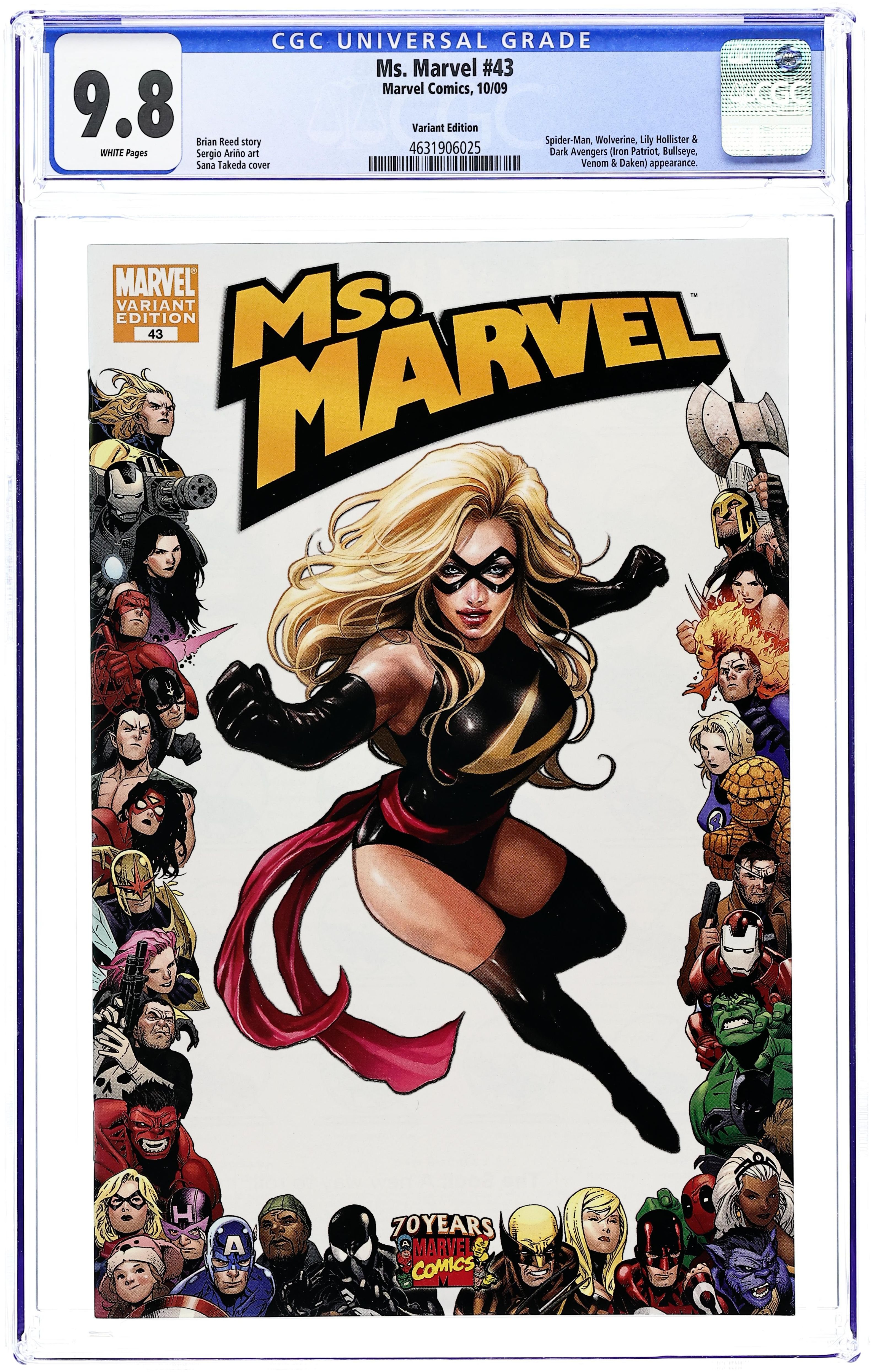 Limited (1 for 10) 70th Frame Variant Cover by SANA TAKEDA. WAR OF THE MARVELS: Part 2 of 5 - Dark Reign tie-in - Written by BRIAN REED. Art by Sergio Arino. Karla Sofen's bad day gets worse as the summer's blockbuster Dark Reign event continues. In Ms. Marvel #44: Hope is crushed and the battle is nearly lost as the Dark Reign event continues! As Karla Sofen faces an unbeatable threat, the legacy of Ms. Marvel hangs in the balance. 32 pages, full color. Cover price $2.99.