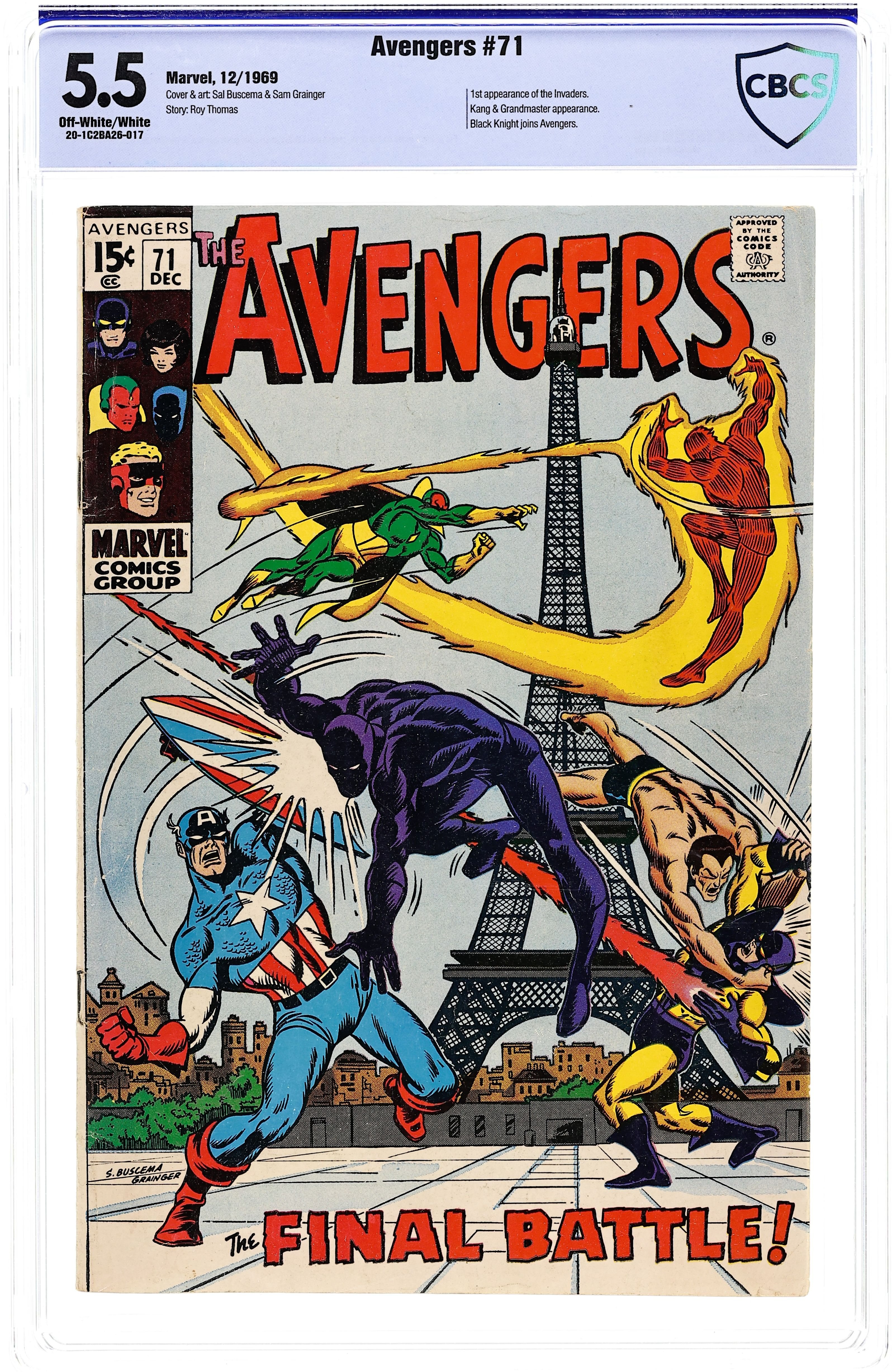 "Endgame!" Part 3 of 3. Guest-starring the Invaders (first appearance). Script by Roy Thomas. Pencils by Sal Buscema. Inks by Sam Grainger. Cover by Buscema and Grainger. The Avengers battle the Invaders in 1941 occupied France! Cameo appearances by Ravonna and the original 6th century Black Knight (aka Sir Percy). Notes: The plot of Avengers 71 overlaps with Invaders Annual 1 published eight years later in 1977. The last page is a pin-up featuring the Avengers. Kang returns in Incredible Hulk 135. This is the second appearance of the original Human Torch in Silver Age/Bronze Age continuity. This issue was reprinted in Marvel Super Action 32 and Giant Size (2008) Avengers Invaders. 36 pages. Cover price $0.15.
