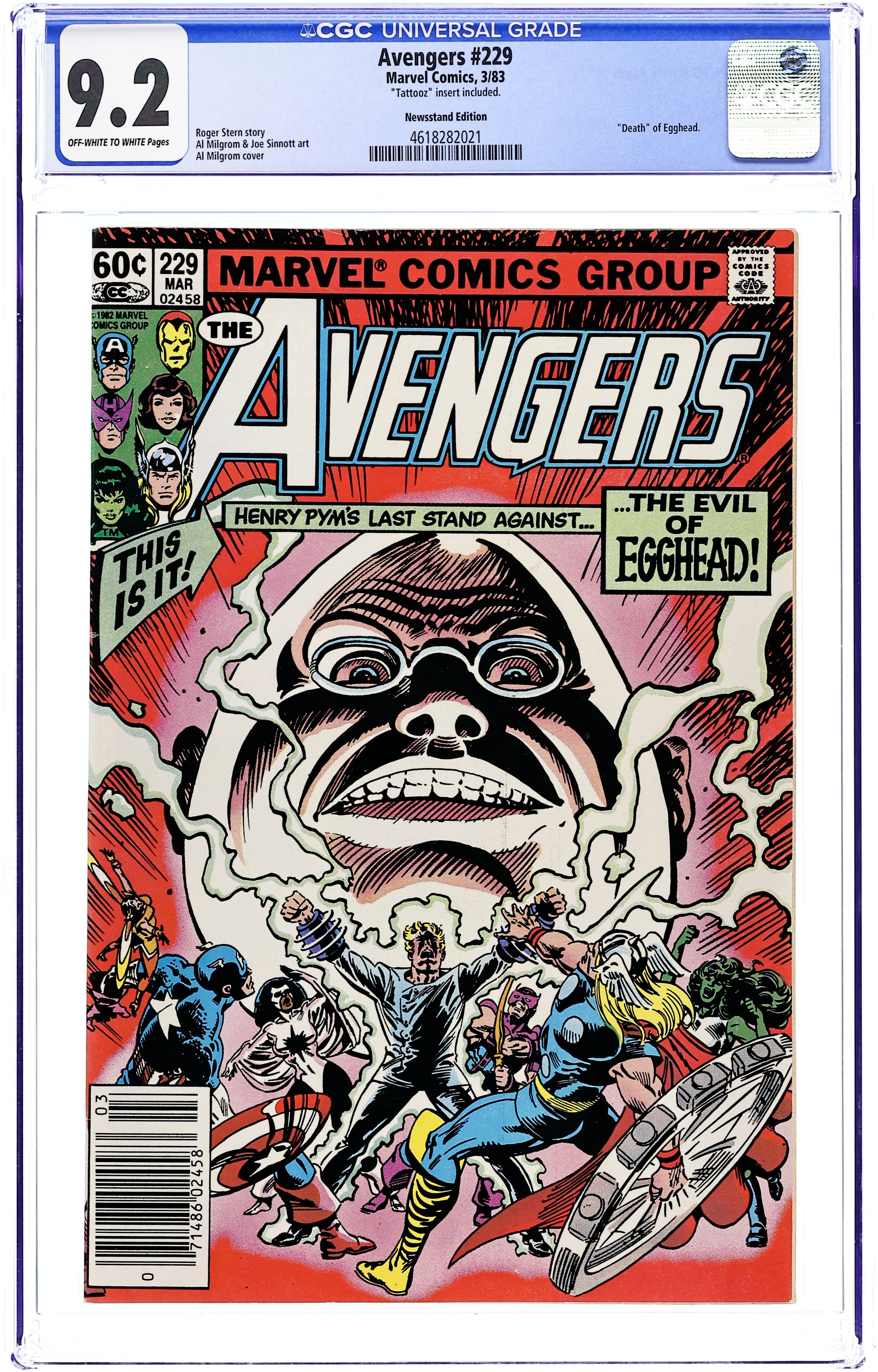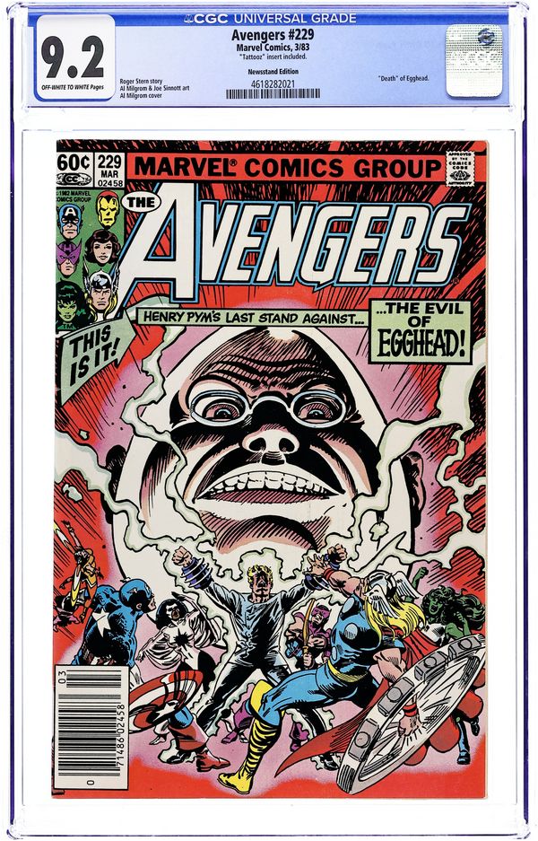 Newsstand Edition. "A Gathering of Evil!" Plot by Jim Shooter. Script by Steven Grant. Pencils by Greg LaRocque. Inks by Brett Breeding. Cover by Greg LaRocque and Al Milgrom. Egghead has a new plan to become famous! But he'll need several super-powered helpers to put his plan into motion! To that end he recruits Moonstone, Tiger Shark, Whirlwind, and the Scorpion to become the new Masters of Evil! And shortly thereafter outside Avengers Mansion...Hawkeye, She-Hulk, Thor, and the Wasp meet the new Masters of Evil face-to-face! Meanwhile inside Ryker's Island, the incarcerated Hank Pym gets into a fight with a fellow inmate and earns some time in solitary confinement. Cameo appearances by Scott Lang (aka Ant-Man) and Dave Cannon (aka Whirlwind). 36 pages Cover price $0.60.