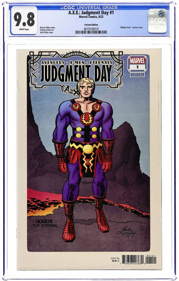 Limited 1 for 50 Retailer Incentive Variant Cover. Written by Kieron Gillen. Art by Guiu Villanova. Cover by Jack Kirby. IN THE LAND OF THE RIGHTEOUS... The X-Men claim they're the planets' new gods. The Eternals know that position is already filled. The Avengers are about to realize exactly how many secrets their so-called friends have kept from them. Years of tension lead to a volcanic eruption as two worlds burn. Who has leaked the X-Men's secrets to their latest foes? Why is Tony Stark abducting an old friend? And who stands in judgment over the whole world? Judgment Day from Kieron Gillen and Valerio Schiti is the apocalyptic emotional event to define the summer. 32 pages, full color. Rated T+ Cover price $5.99.