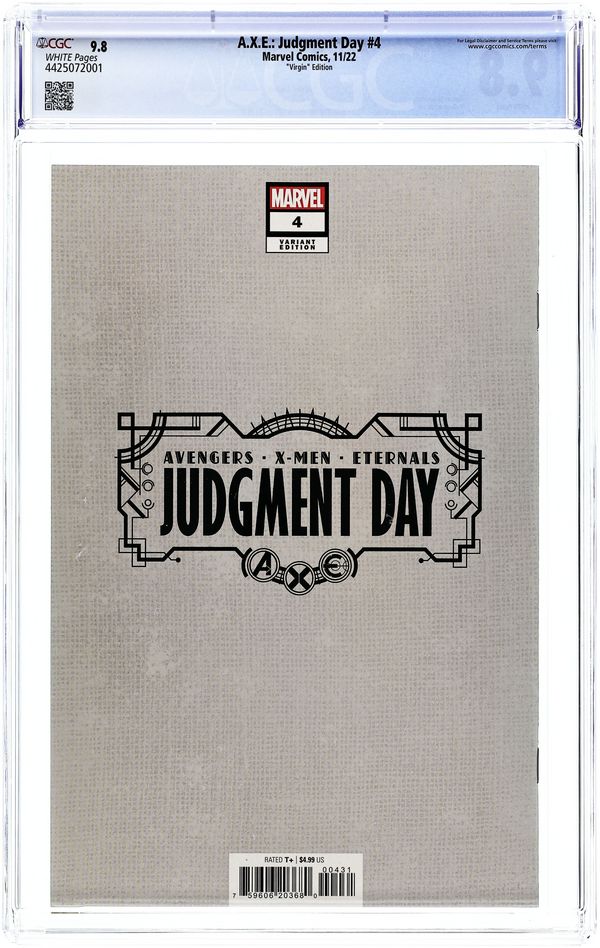 Comics Illuminati (Unknown Comics, Street Level Hero, and Comic Traders) Exclusive Virgin Cover by David Nakayama. Written by Kieron Gillen. Art by Pasqual Ferry. FIRST SHOT FIRED - JUDGMENT IS COMING! The Eternals know that the mutants have conquered death. But what are they going to do about it? The oldest immortals on Earth eye up the newest, and the doomsday clock starts to tick toward Judgment Day. 28 pages, full color. Rated T+