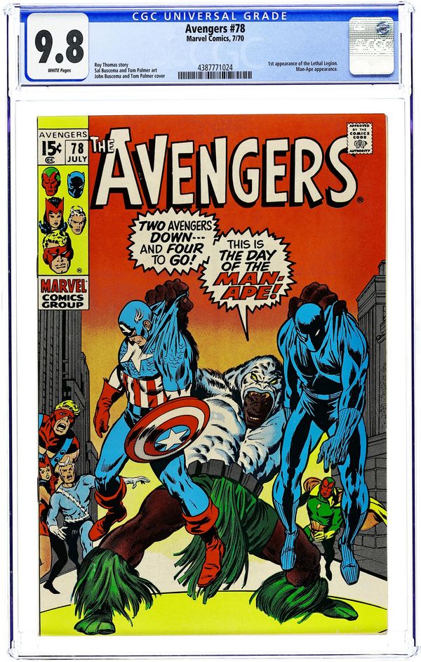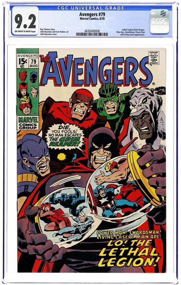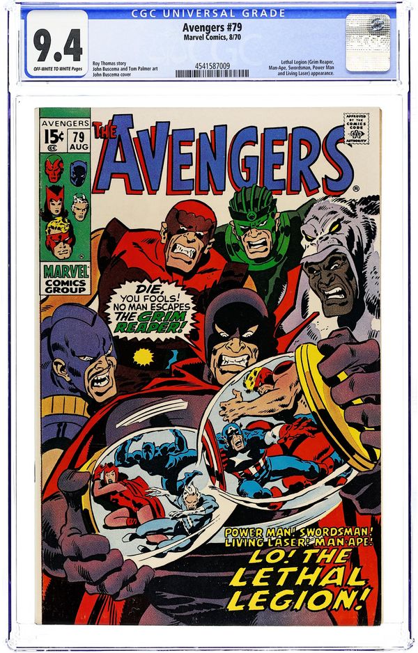 "Lo! The Lethal Legion!" Part 2 of 2. Script by Roy Thomas. Pencils by John Buscema. Inks by Tom Palmer. Cover by John Buscema. The Grim Reaper is back with a new scheme to destroy the Avengers! And this time Eric Williams has brought along some super-powered helpers: the Swordsman, Living Laser, Power Man, and the Man-Ape! Truly a Lethal Legion! But Earth's Mightiest Heroes have responded by summoning the golden avenger and the thunder god to their ranks! After the Black Panther momentarily escapes and warns his teammates about the reaper's plan, the colossal clash begins! The Mighty Avengers vs. the Lethal Legion in the heart of Avengers Mansion! While the battle rages the Grim Reaper's gang appears to seize the upper hand, but looks can be deceiving! As the Vision will prove! Avengers Lineup: Black Panther, Captain America, Goliath, Iron Man, Quicksilver, Scarlet Witch, Thor, and the Vision. (Notes: The Grim Reaper returns in Avengers 102. The Swordsman appears next in Avengers 100. The Grim Reaper discovers the connection between Wonder Man (aka Simon Williams) and the Vision in this issue. This story was reprinted in 1993 in the trade paperback: The Greatest Battles of the Avengers.) 36 pages. Cover price $0.15.