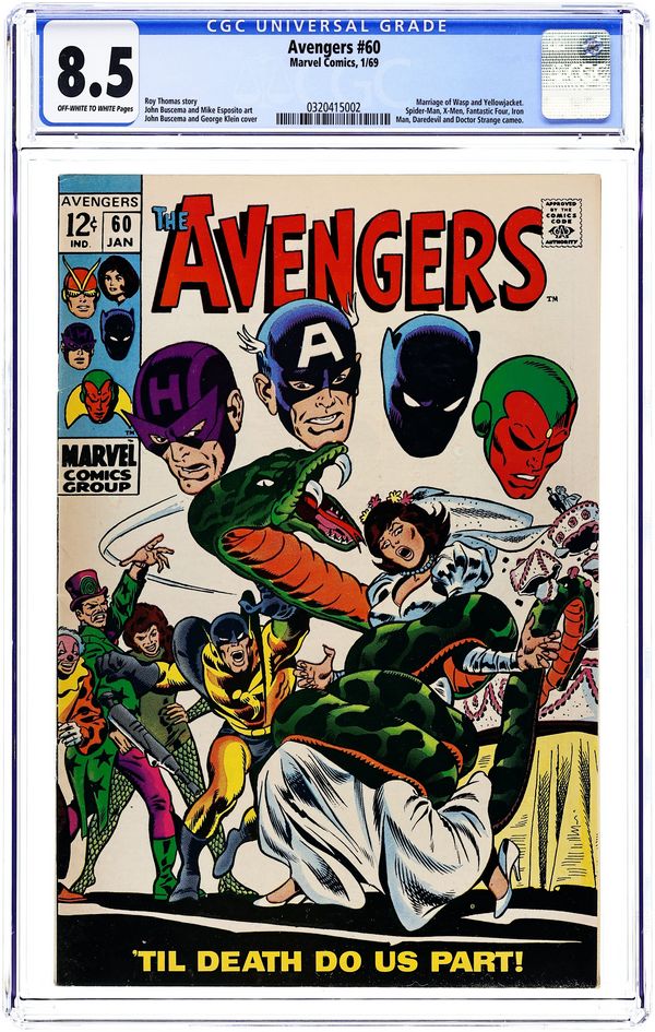 The wedding of the Wasp and Yellowjacket in "...Till Death Do Us Part!" Part 2 of 2. Script by Roy Thomas. Pencils by John Buscema. Inks by Mike Esposito (as Mickey Demeo). Cover by John Buscema and George Klein (with alterations by John Romita). Avengers Mansion is abuzz as Jarvis makes preparations for the surprise wedding of Janet Van Dyne and Yellowjacket! The Wasp's teammates still can't believe she is dumping Hank Pym for thiscostumed stranger! But instead of worrying about Jan and her newly betrothed, maybe the assembled heroes should take a closer look at the caterers! When the happy bride cuts the cake, the Circus of Crime attacks! Will the Ringmaster and his minions rend asunder...what has just been joined together? Not if Goliath has a say in the matter! A fun issue! Cameoappearances by the Fantastic Four, Crystal, Black Knight, Daredevil, Dr. Strange, Iron Man, Nick Fury, Spider-Man, and the original X-Men. Avengers Lineup: Black Panther, Captain America, Hawkeye, Wasp, Yellowjacket, and the Vision. 36 pages. Cover price 12 cents. Cover price $0.12.