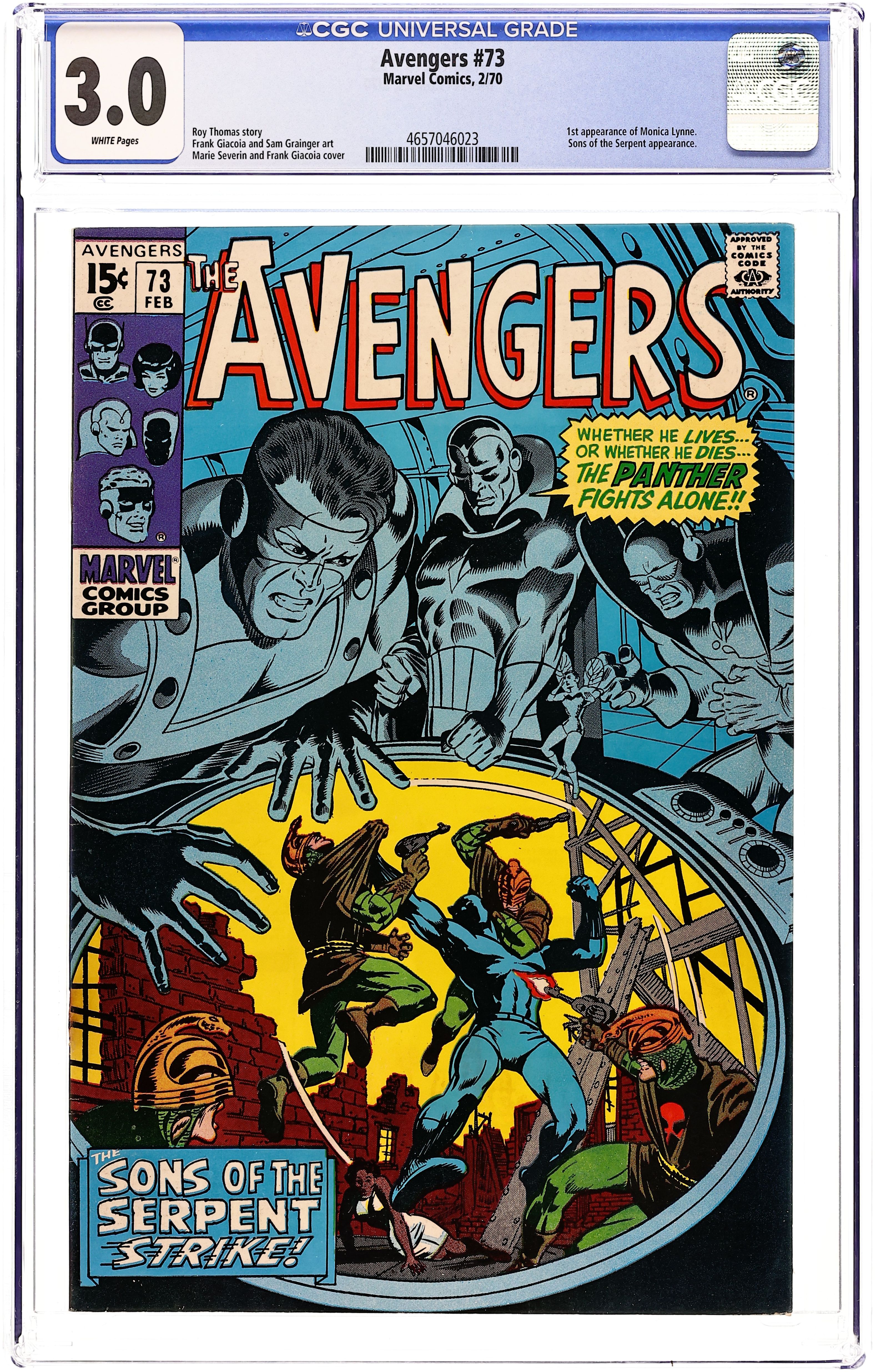 "The Sting of the Serpent" Part 1 of 2. Script by Roy Thomas. Pencils by Frank Giacoia. Inks by Sam Grainger. Cover by Marie Severin and Sam Grainger. The Sons of the Serpent prowl New York City once again! And the venomous hate group has a new target! An up-and-coming singer named Monica Lynne! But fortunately for the talented vocalist, she has a guardian angel or perhaps better yet…a guardian panther! The Black Panther successfully stops the serpents' abduction attempt of Monica! However, the next day when T'Challa hunts the serpents on his own, he falls prey to the radical supremacist group! The Sons of the Serpent have the panther! Will the Avengers be next? First appearance of Monica Lynne. Flashback cameos by Bill Foster and Captain America to recap the serpents' previous encounter with Earth's Mightiest Heroes in Avengers 32 & 33. Avengers Lineup: Black Panther, Goliath, Vision, Yellowjacket, and the Wasp. (Notes: This issue features a classic Marie Severin cover. Her most well-known Avengers cover and one of the very few she penciled for the Avengers series.) 36 pages. Cover price $0.15.