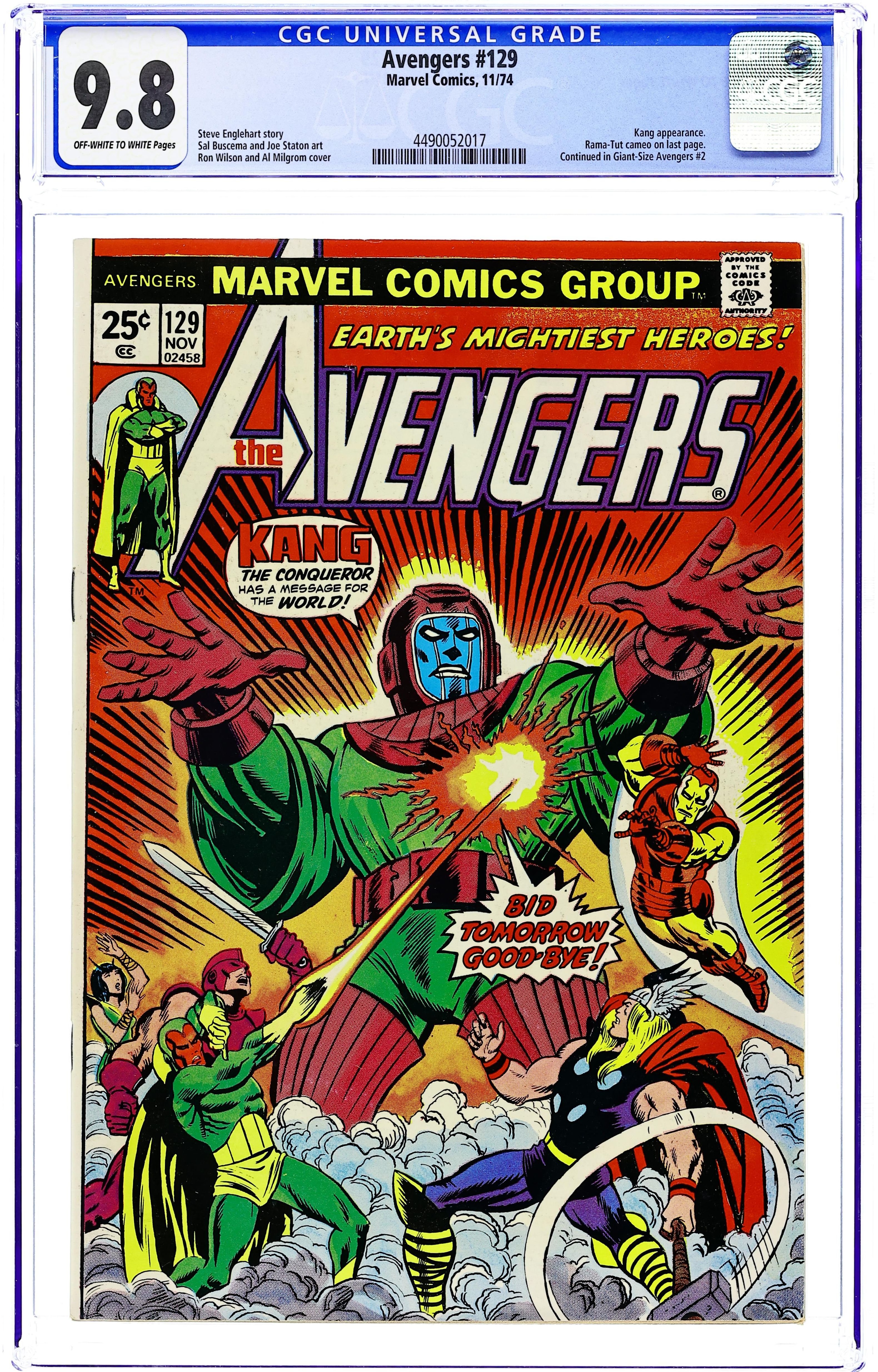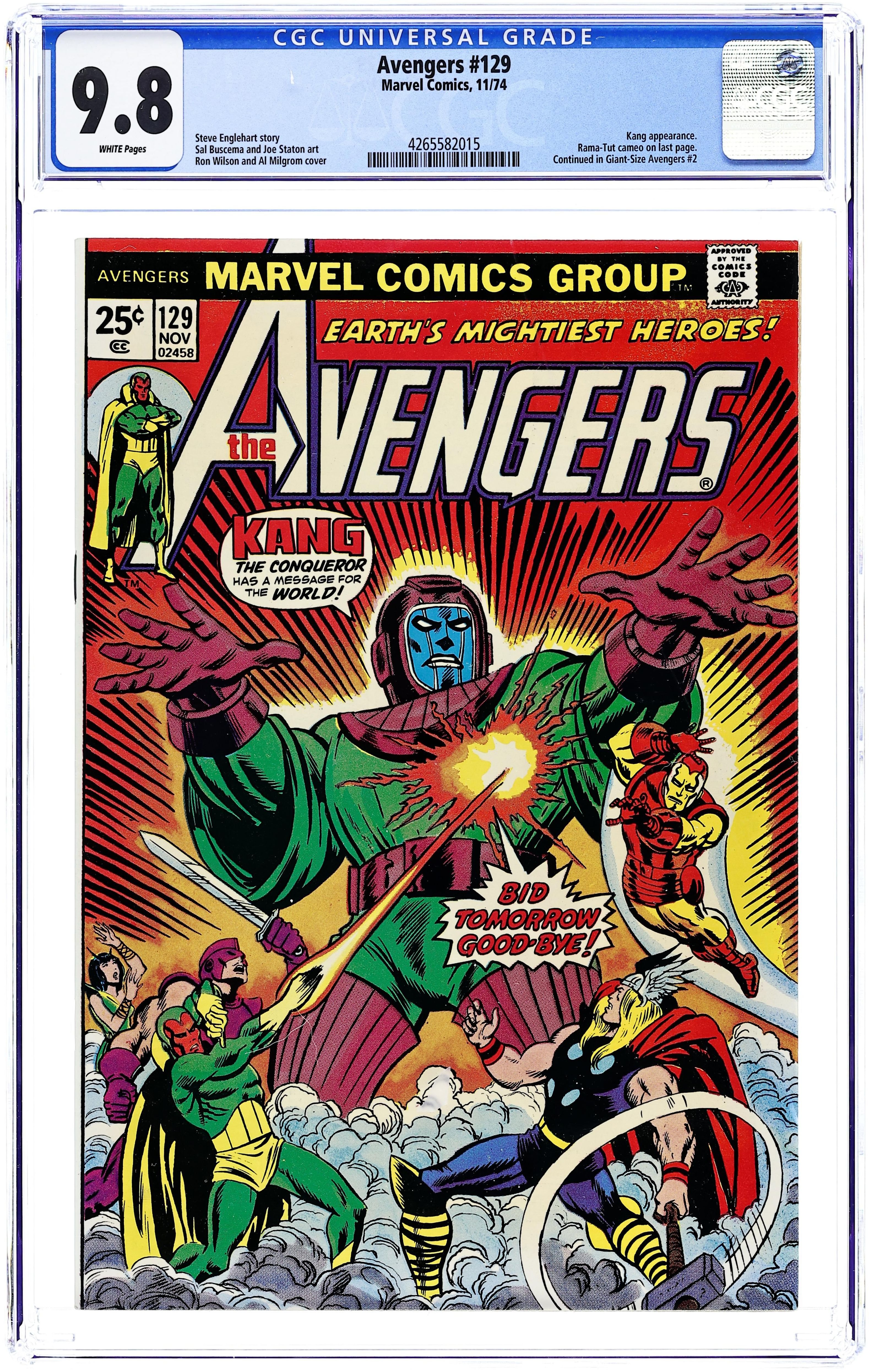 "Bid Tomorrow Goodbye!" Script by Steve Englehart. Art by Sal Buscema (breakdowns) and Joe Staton (finishes). Cover by Ron Wilson and Mike Esposito. A bright shining star appears over Avengers Mansion! What does the radiant beacon foretell? Kang the Conqueror thinks he knows! And thus begins the Celestial Madonna saga! The 41st century Master of Time and his macrobots attack the Avengers outside their mansion! After overwhelming the six avengers, Kang absconds with five of them plus Agatha Harkness! The Conqueror deems the Swordsman as unworthy and leaves him behind. Will Kang end up regretting that decision? The former sword-wielding super-villain certainly has his work cut out for him! However, the Swordsman catches a big break when Agatha Harkness telepathically reveals Kang's hideaway! The centuries-old pyramids of Egypt! After arriving in the Egyptian desert, the Swordsman desperately needs an ally! Could one of the ancient pharaohs still be lurking around to help? Story continues in Giant-Size Avengers 2. Cameo appearance by Rama-Tut. Avengers Lineup: Iron Man, Mantis, Scarlet Witch, Swordsman, Thor, and the Vision. (Notes: The classic Celestial Madonna storyline runs through Avengers 129-135 and Giant-Size Avengers 2-4. Kang previously battled Earth's Mightiest Heroes in Avengers (1st series) 71. The letters page contains Marvel Value Stamp Series A #88 The Leader.) 36 pages Cover price $0.25.